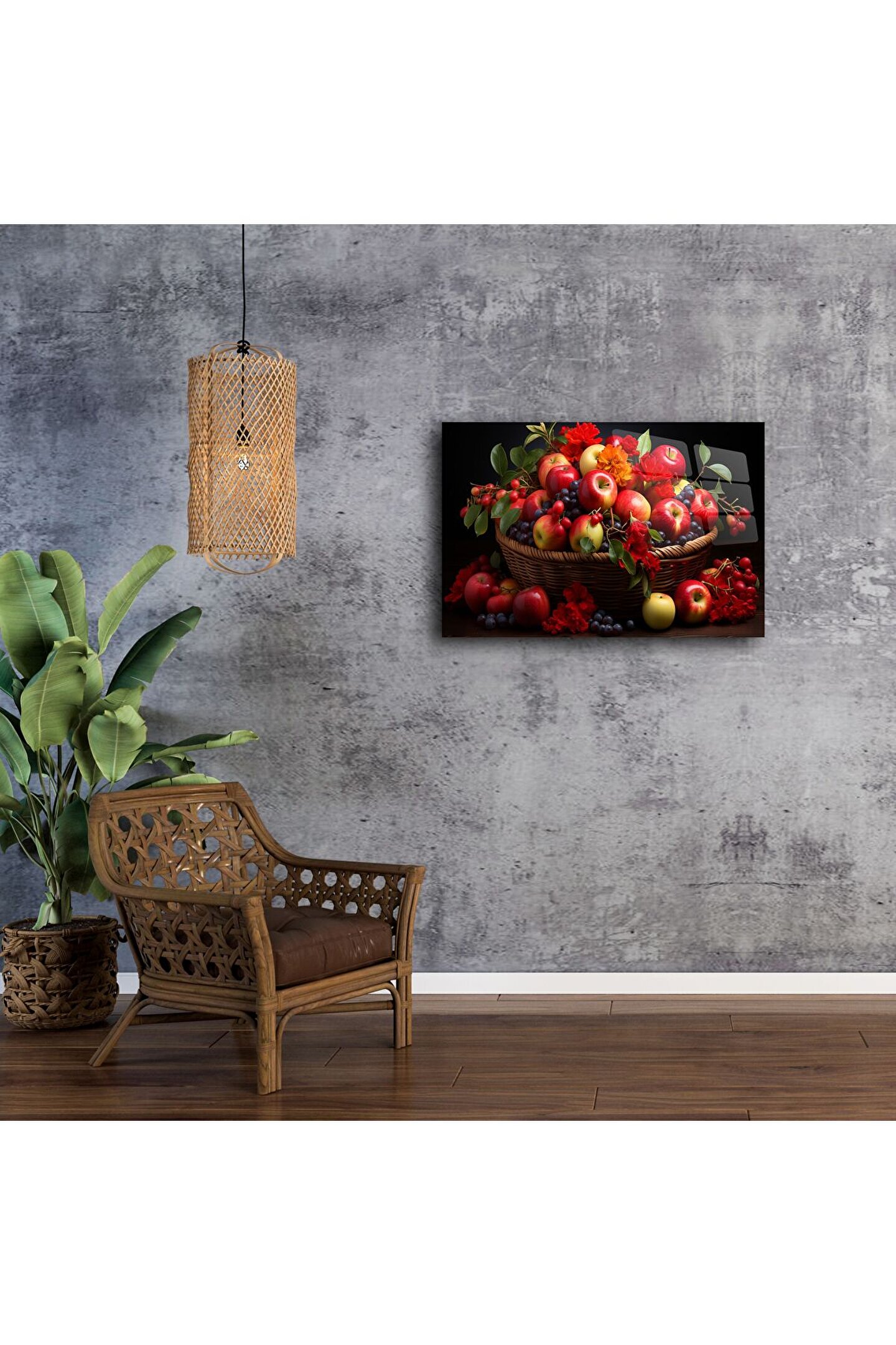 Doğanın canlı tonlarını evinize taşıyan bu şık cam tablo, taptaze meyvelerin zamansız güzelliğini göz alıcı bir kompozisyonda sunuyor. Kırmızı elmalar, üzümler ve çiçek dokunuşlarıyla dolu bu tablo, hem mutfağınıza sıcaklık katacak hem de yaşam alanlarınızı sanatla buluşturacak.