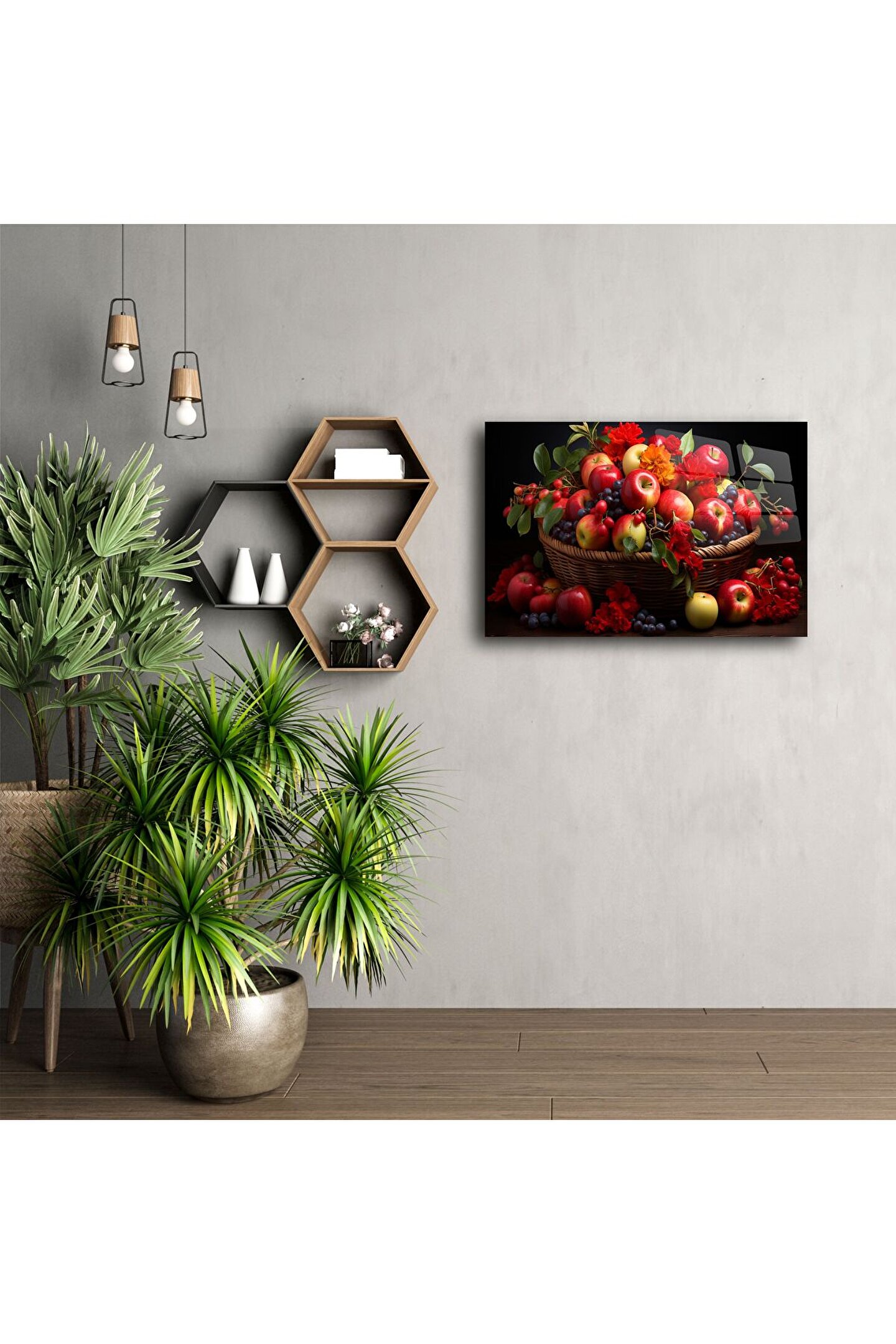 Doğanın canlı tonlarını evinize taşıyan bu şık cam tablo, taptaze meyvelerin zamansız güzelliğini göz alıcı bir kompozisyonda sunuyor. Kırmızı elmalar, üzümler ve çiçek dokunuşlarıyla dolu bu tablo, hem mutfağınıza sıcaklık katacak hem de yaşam alanlarınızı sanatla buluşturacak.