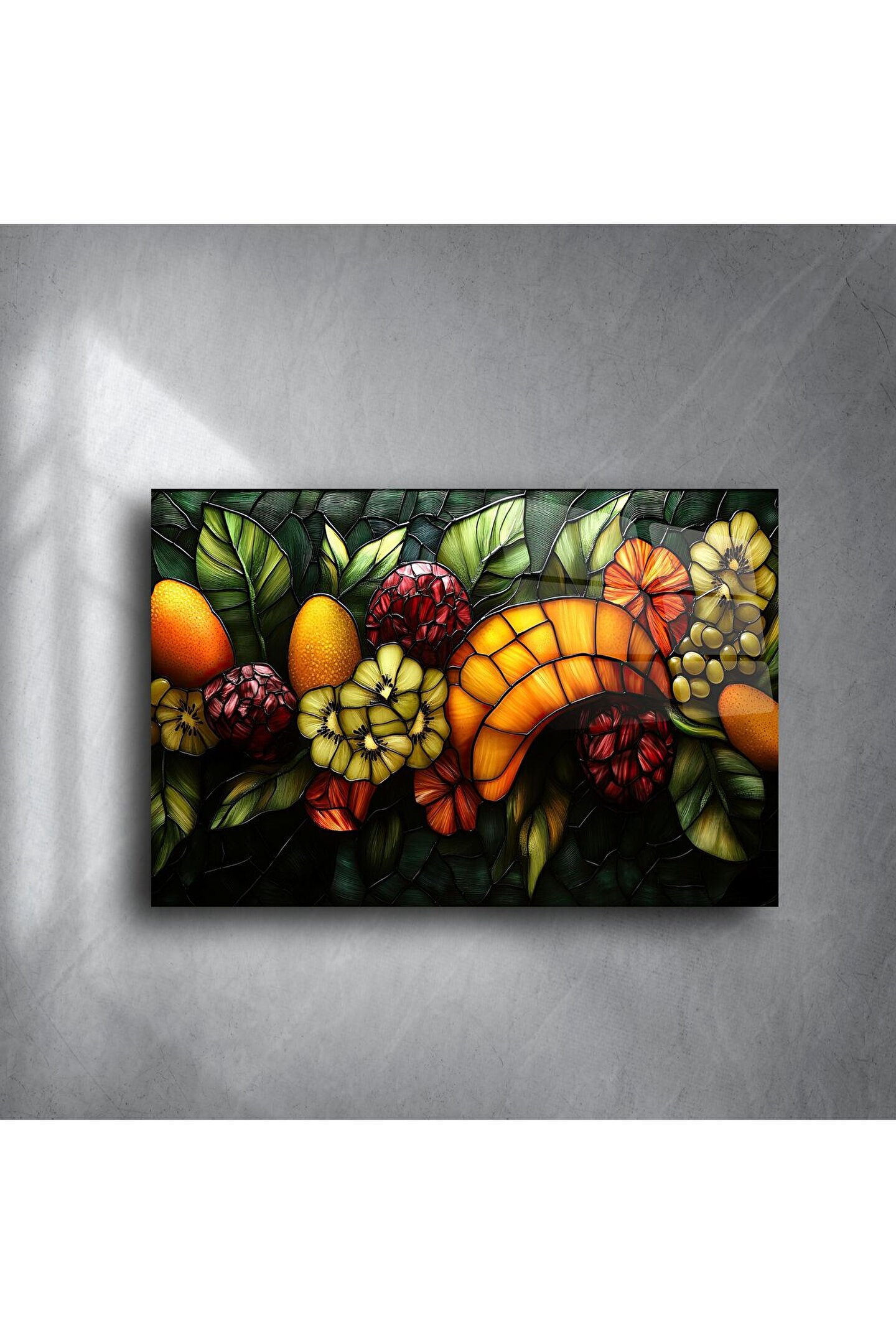 Bu büyüleyici cam duvar paneli, tropikal meyve desenleriyle süslenmiş canlı vitray cam sanatıyla doğanın enerjisini yaşam alanınıza taşır. Zengin renk tonlarıyla hazırlanmış bu el yapımı parça, sanatı ve doğayı sevenler için mükemmel bir seçimdir.