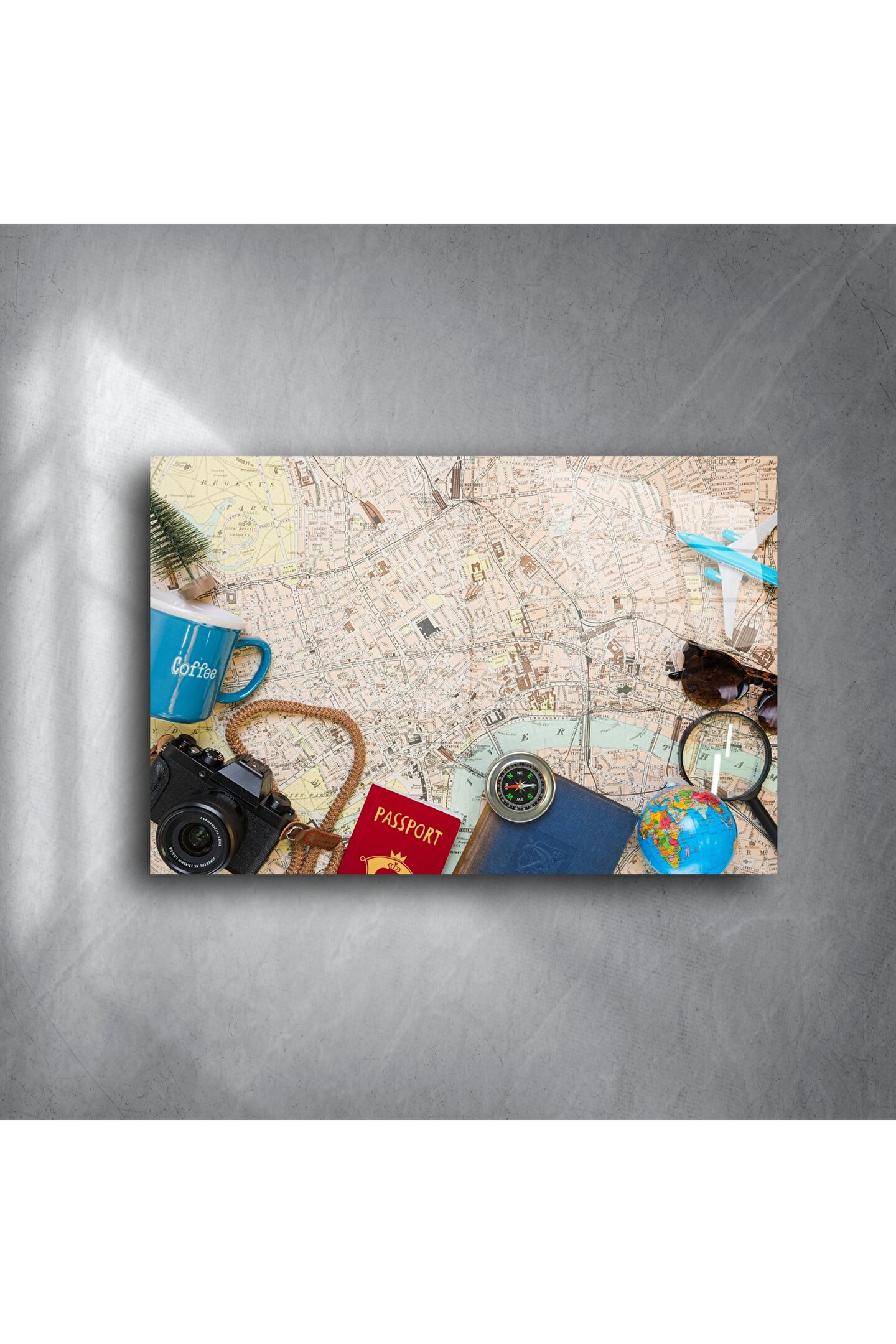 Seyahatin büyüsünü yansıtan bu retro tasarımlı cam tablo, vintage harita üzerinde pasaport, pusula, kamera ve dünya figürleriyle dekoratif bir yolculuk sunar. Evinizde keşif ruhunu yaşatmak, her bakışta macera hissi uyandırmak isteyenler için tasarlandı.