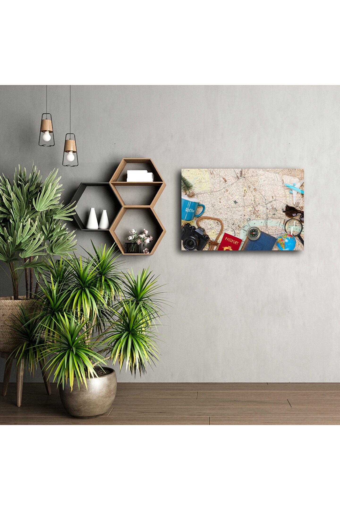 Seyahatin büyüsünü yansıtan bu retro tasarımlı cam tablo, vintage harita üzerinde pasaport, pusula, kamera ve dünya figürleriyle dekoratif bir yolculuk sunar. Evinizde keşif ruhunu yaşatmak, her bakışta macera hissi uyandırmak isteyenler için tasarlandı.