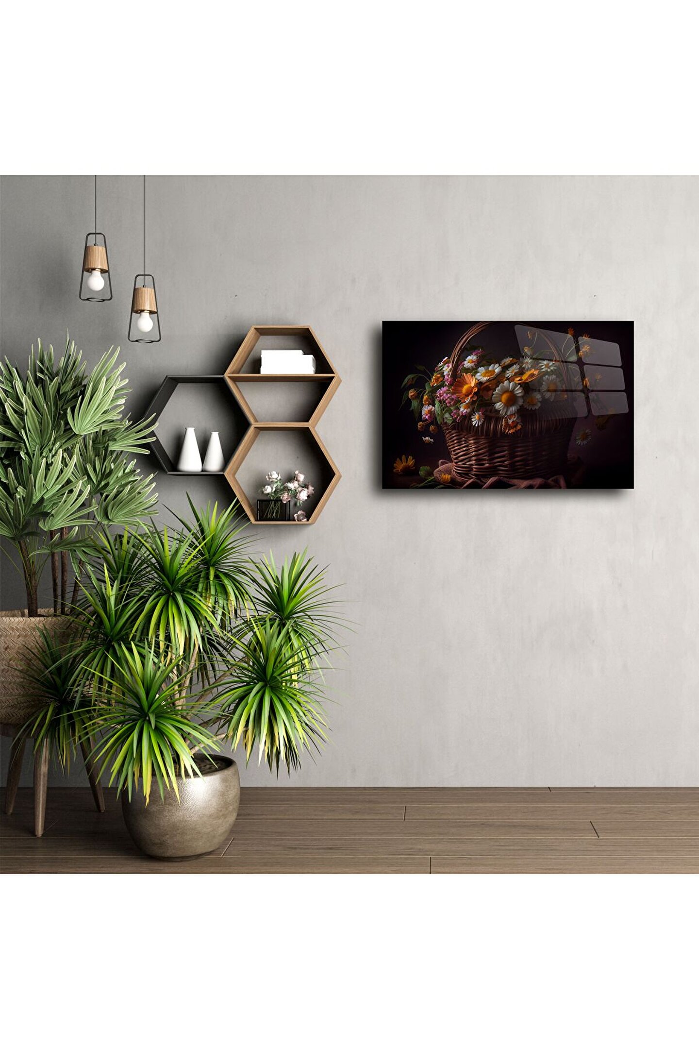 LEYLASER Rustik Hasır Sepette Papatya ve Bahar Çiçekleri Kanvas Cam Tablo