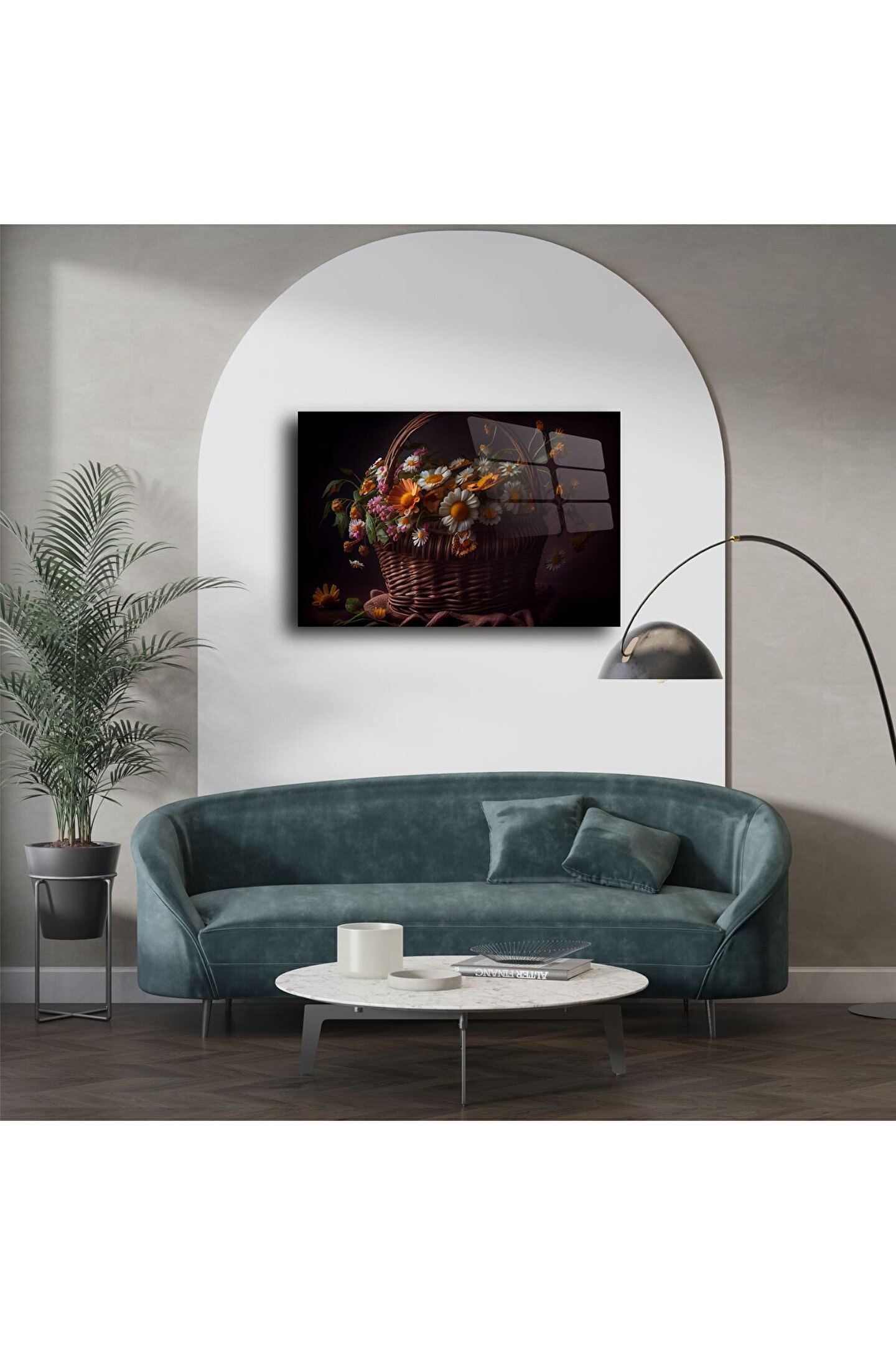 LEYLASER Rustik Hasır Sepette Papatya ve Bahar Çiçekleri Kanvas Cam Tablo