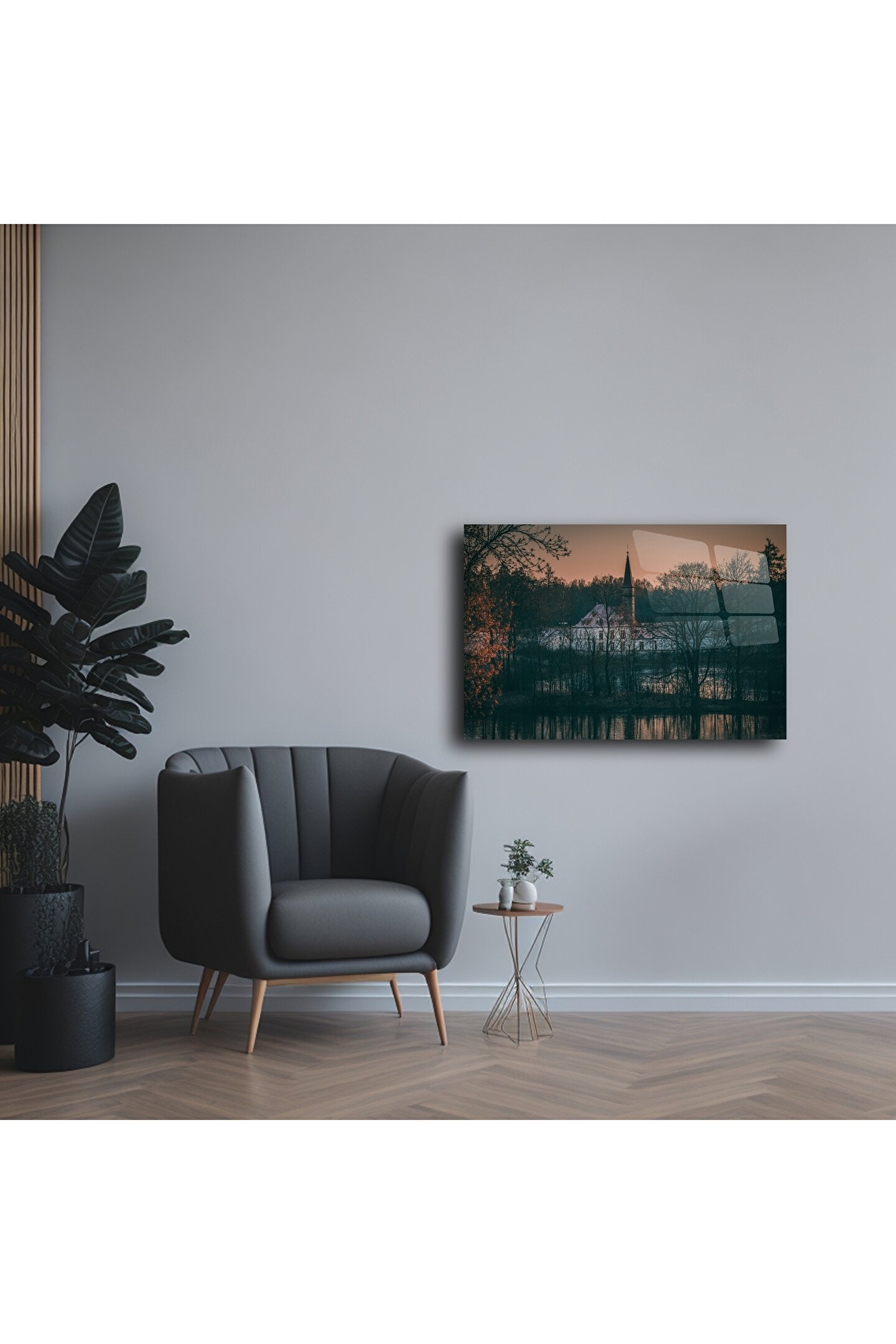 Bu rustik cam tablo, ormanla çevrili tarihi bir kiliseyi gün batımının yumuşak ışıklarıyla buluşturuyor. Doğanın içinde saklanmış bir mabedi andıran kompozisyon, yaşam alanınıza dinginlik ve sanatsal bir dokunuş kazandırır.