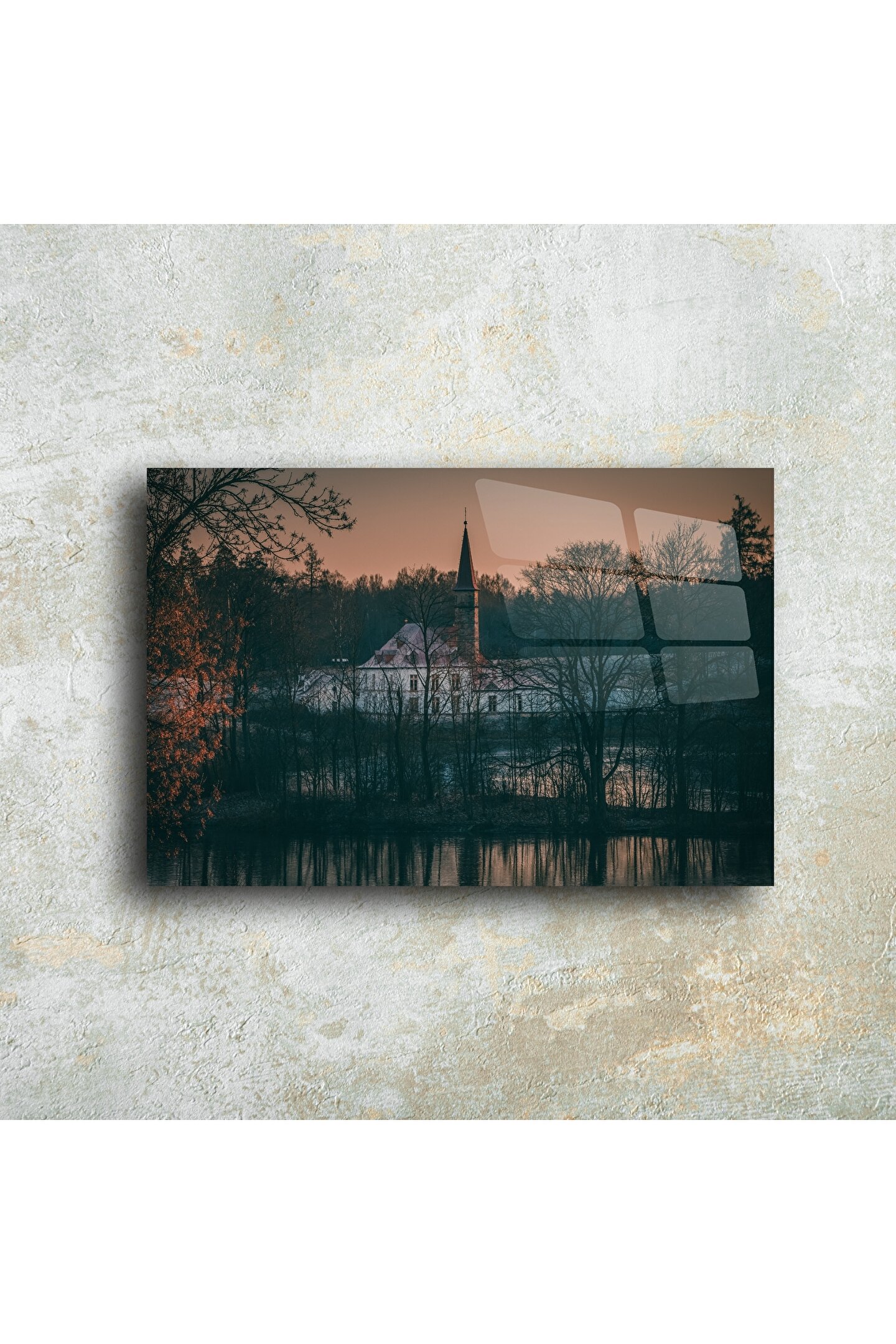 Bu rustik cam tablo, ormanla çevrili tarihi bir kiliseyi gün batımının yumuşak ışıklarıyla buluşturuyor. Doğanın içinde saklanmış bir mabedi andıran kompozisyon, yaşam alanınıza dinginlik ve sanatsal bir dokunuş kazandırır.