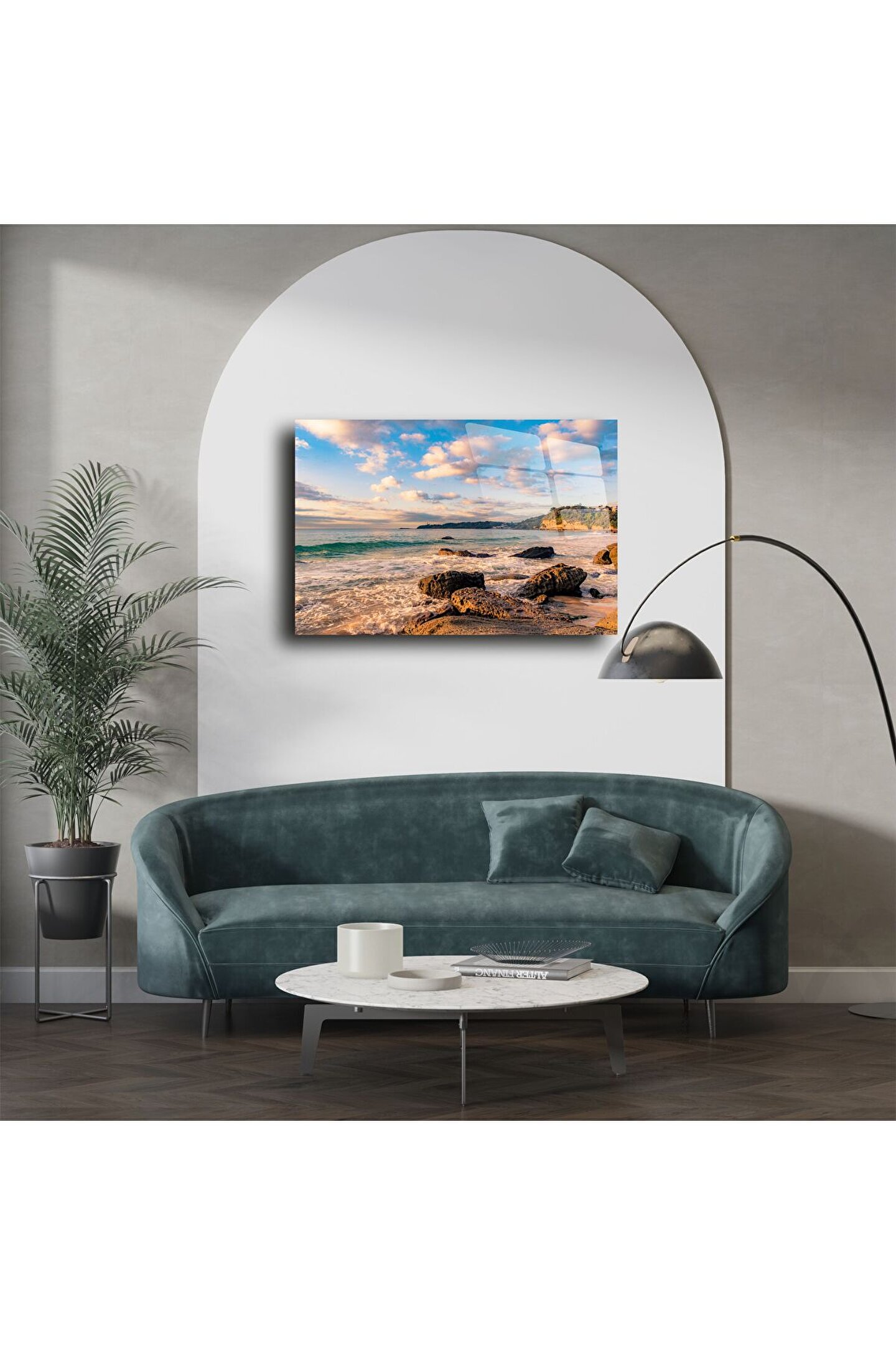 Serin renk tonlarıyla bezeli bu huzur verici deniz manzaralı cam tablo, evinize dinginlik ve zarafet katıyor. Cam yüzey üzerine yüksek çözünürlükle basılan plaj kompozisyonu, gün batımının yumuşak ışıkları ve suyun sakin dalga dokusuyla birleşiyor. Minimalist dekor stillerine uyumlu olan bu sanat eseri, modern iç mekanlara doğal bir nefes katar.