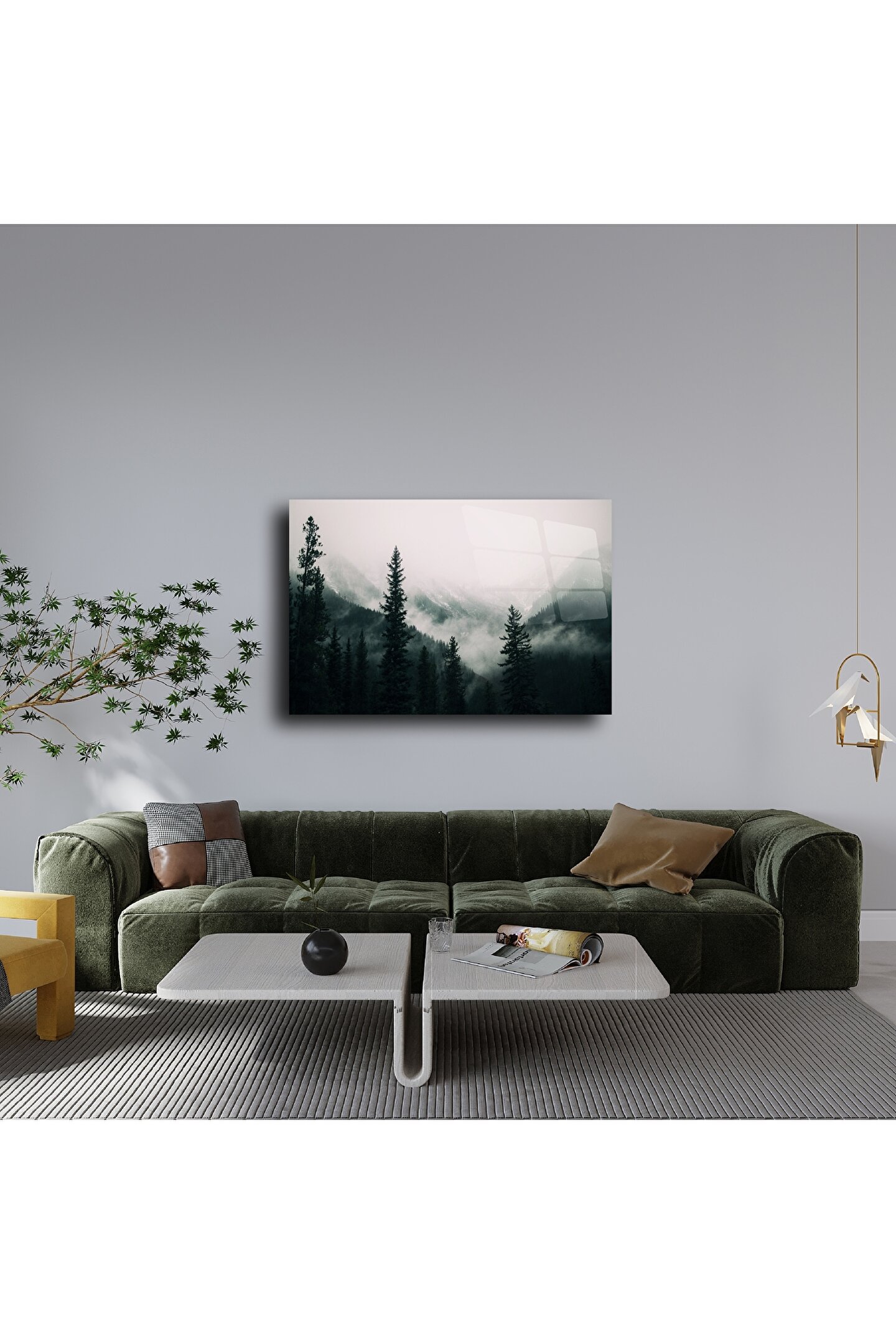 Sisli ormanların huzurlu sessizliğine adım atın. Bu Cam Orman Tablosu, çam ağaçlarının arasından süzülen puslu dağ manzarası ile doğayla derin bir bağ kurmak isteyenler için tasarlandı. Yüksek parlaklığa sahip temperli cam üzerine baskı, çağdaş ve şık bir görünüm sunarak ister rustik bir dağ evinde ister şehirde minimalist bir loftta şıklığıyla öne çıkar.