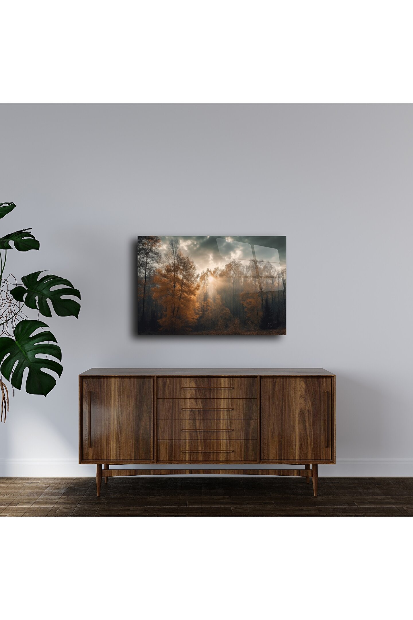 Bu cam duvar tablosu, bulutların arasından süzülen güneş ışığıyla aydınlanan sisli bir ormanda geçen büyülü bir anı ölümsüzleştiriyor. Sonbaharın sıcak tonları, doğanın ruhunu yansıtan zarif bir atmosfer yaratırken, cam yüzey ışığı muhteşem şekilde yansıtarak görüntüyü canlı ve derin hale getiriyor.