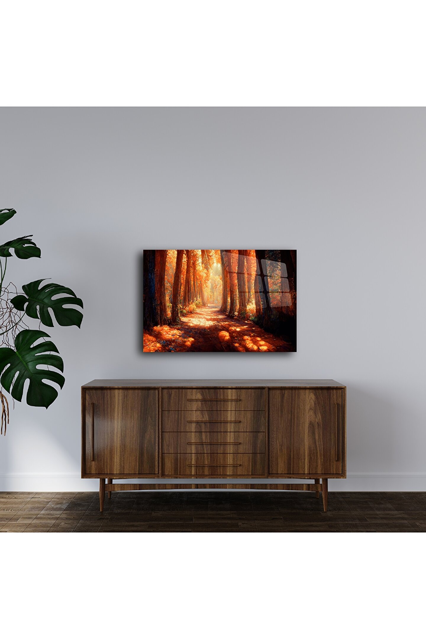 Bu etkileyici cam duvar tablosu, altın turuncuya boyanmış uzun ağaçların oluşturduğu büyüleyici bir orman yolunu sunuyor. Gün ışığı, yaprakların arasından süzülerek sıcak ve sakinleştirici bir atmosfer yaratırken, cam yüzey ışıkla adeta dans ediyor.