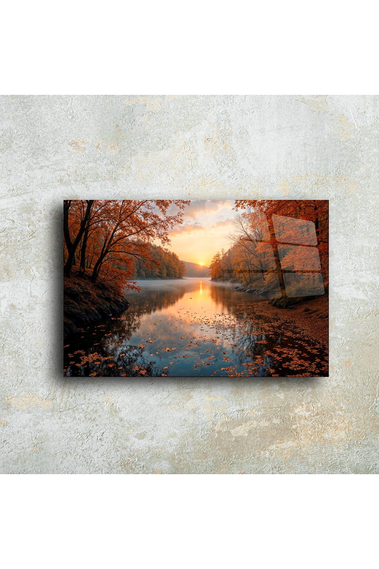 Bu büyüleyici cam tablo, sonbaharın sıcak tonlarını ve doğanın dinginliğini evinize taşıyor. Altın rengi yaprakların süslediği orman, göle yansıyan gün batımıyla birleşerek adeta huzurun cam üzerindeki yansıması oluyor.