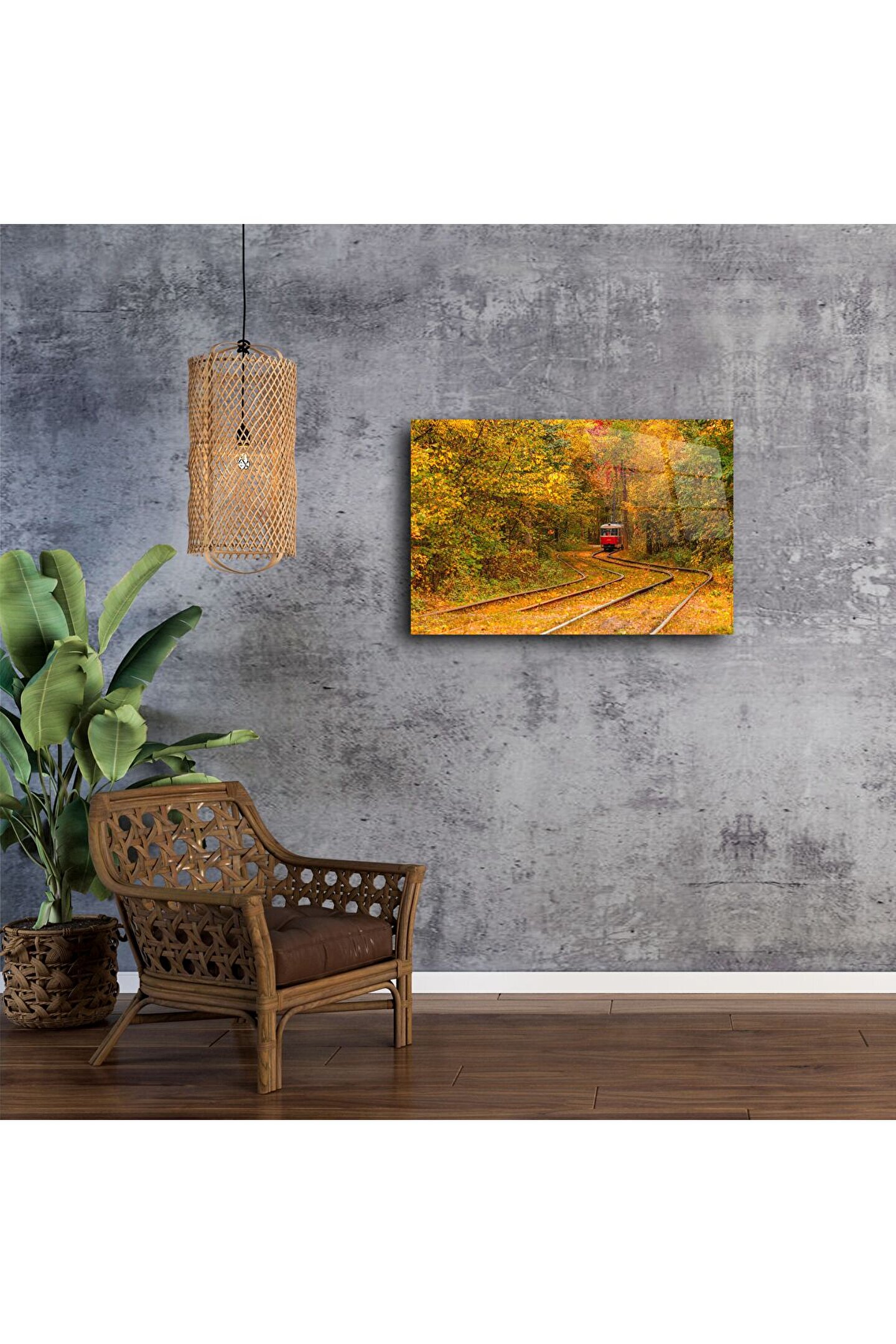 Nostaljiyi ve doğanın sıcaklığını bir araya getiren bu etkileyici cam tablo, sarı yapraklarla kaplı orman yolunda ilerleyen kırmızı tramvayı büyüleyici bir sahneyle sunuyor. Zamanın yavaş aktığı, huzurun hissedildiği bu manzara; evinizin ya da ofisinizin atmosferini tamamen değiştirecek.