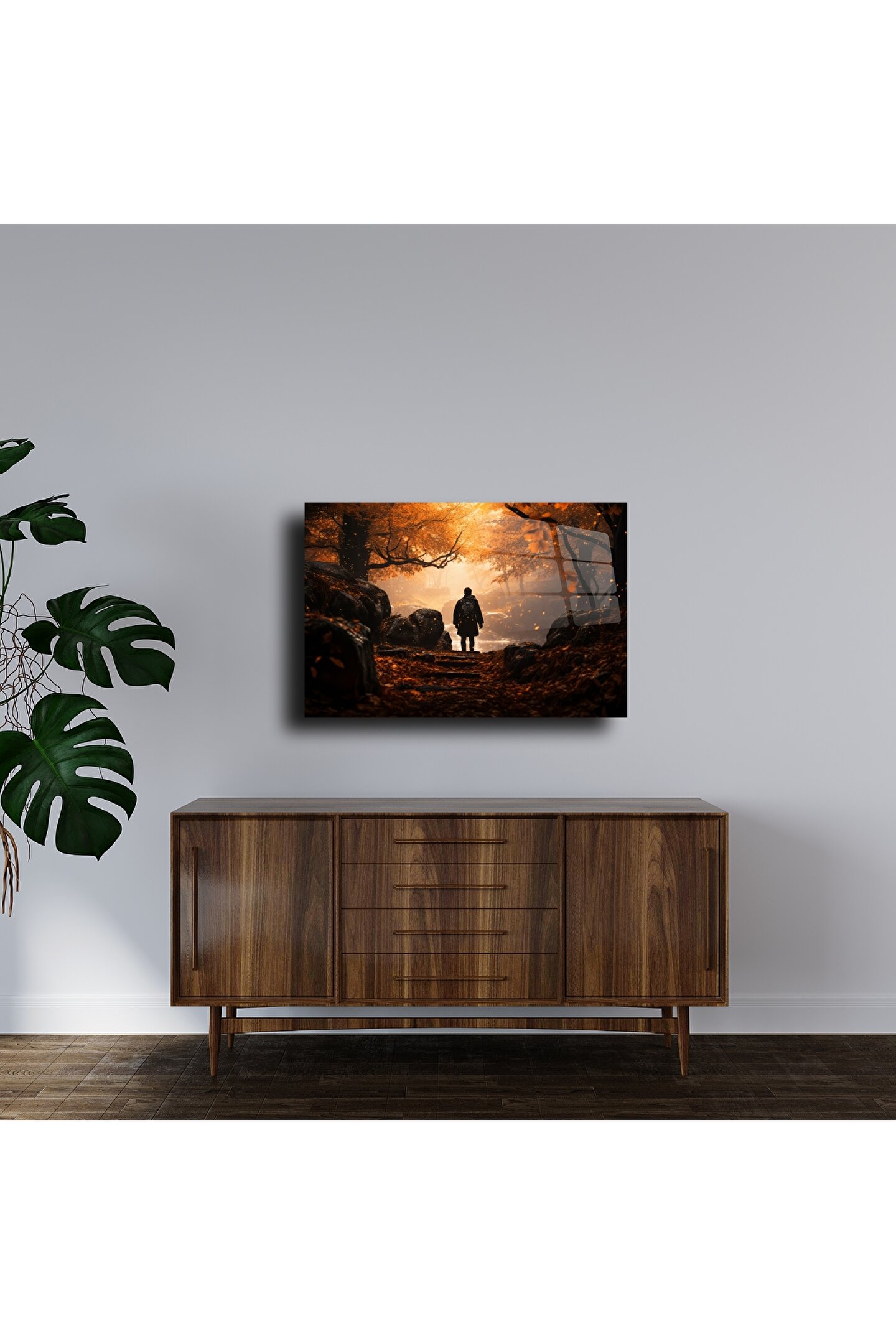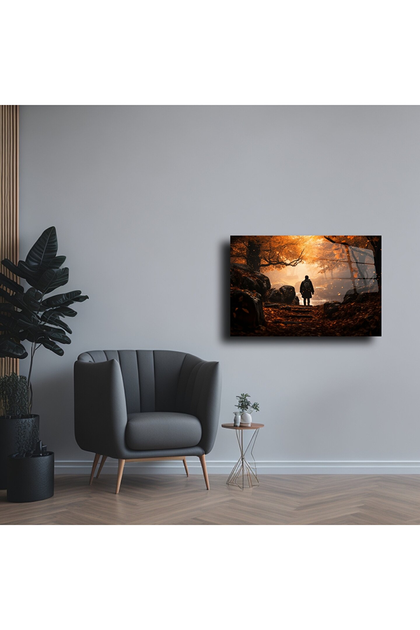 Bu cam duvar tablosu, turuncu yapraklarla kaplı bir sonbahar ormanında yalnız bir yolcunun huzurlu yürüyüşünü yansıtarak izleyiciyi içsel bir keşfe davet ediyor. Gün batımı ışığının ağaçların arasından süzüldüğü bu sahne, derin düşünce, yalnızlık ve huzur temalarını ustalıkla işler.