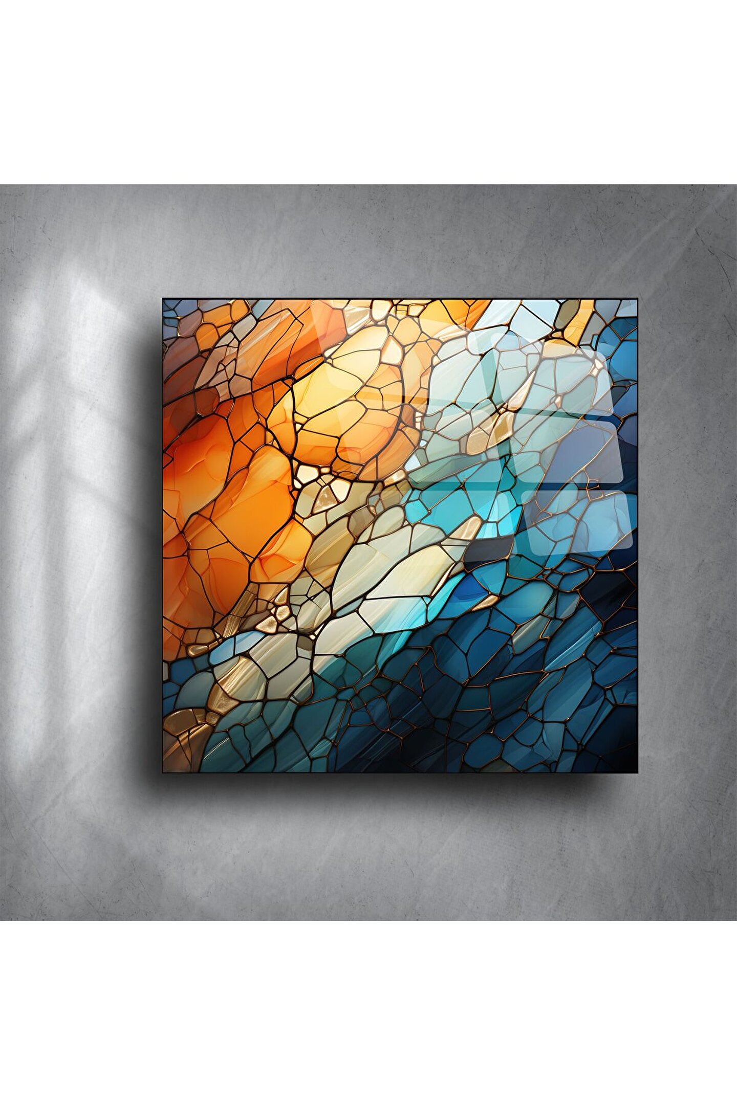 Modern sanatı yaşam alanınıza taşıyan bu soyut cam tablo, dinamik turuncu ve mavi tonların armonisiyle tasarlanmıştır. Renk geçişleriyle derinlik hissi yaratan bu cam panel, minimalist çizgilerle çağdaş bir atmosfer sunar.