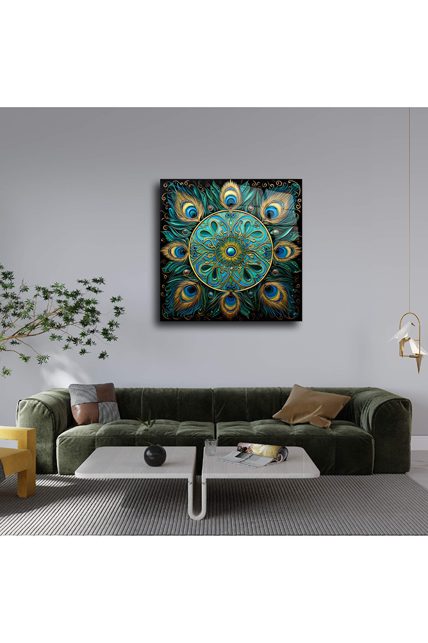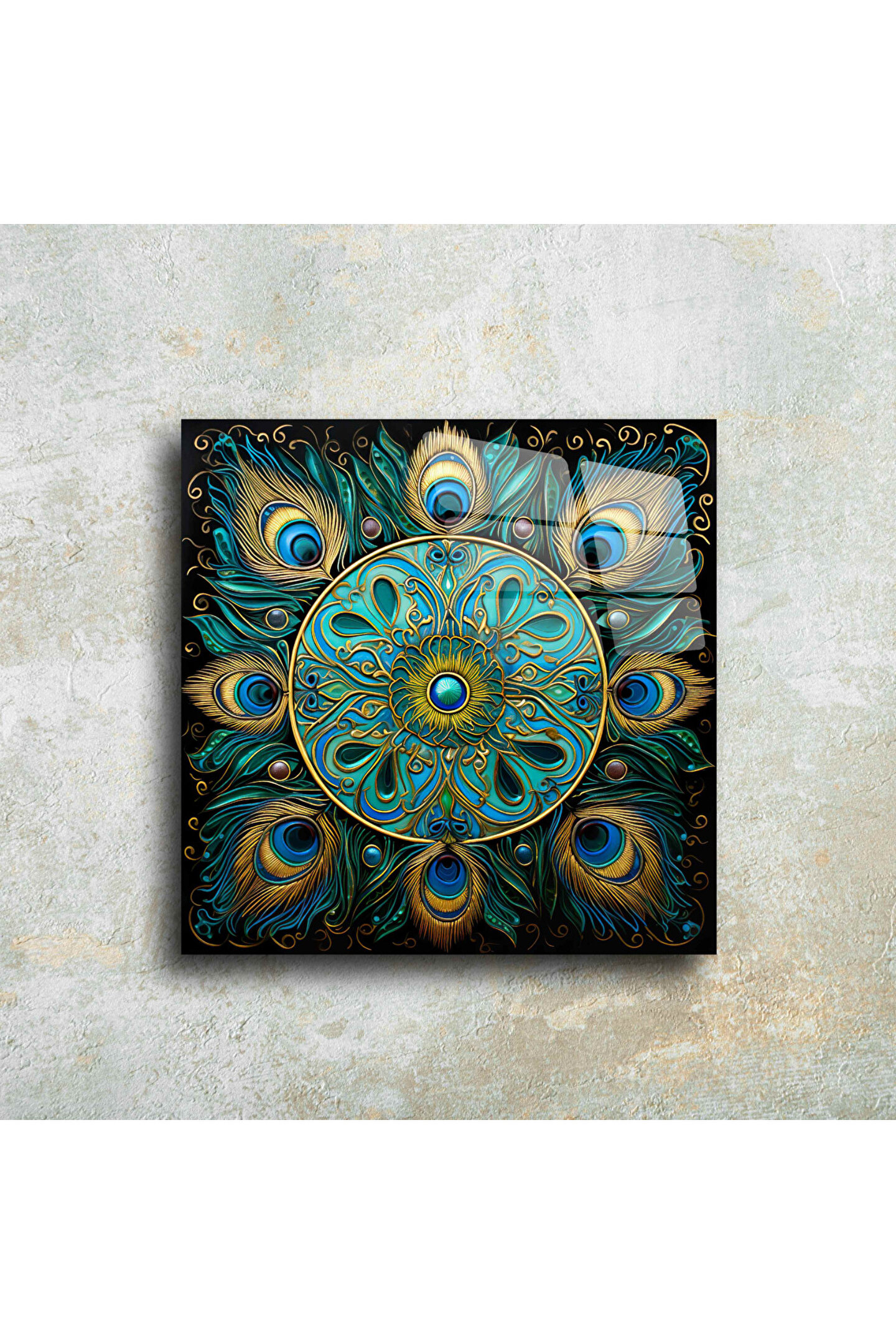 LEYLASER Tavus Kuşu Tüyü Mandala Cam Tablo Duvar Dekoru