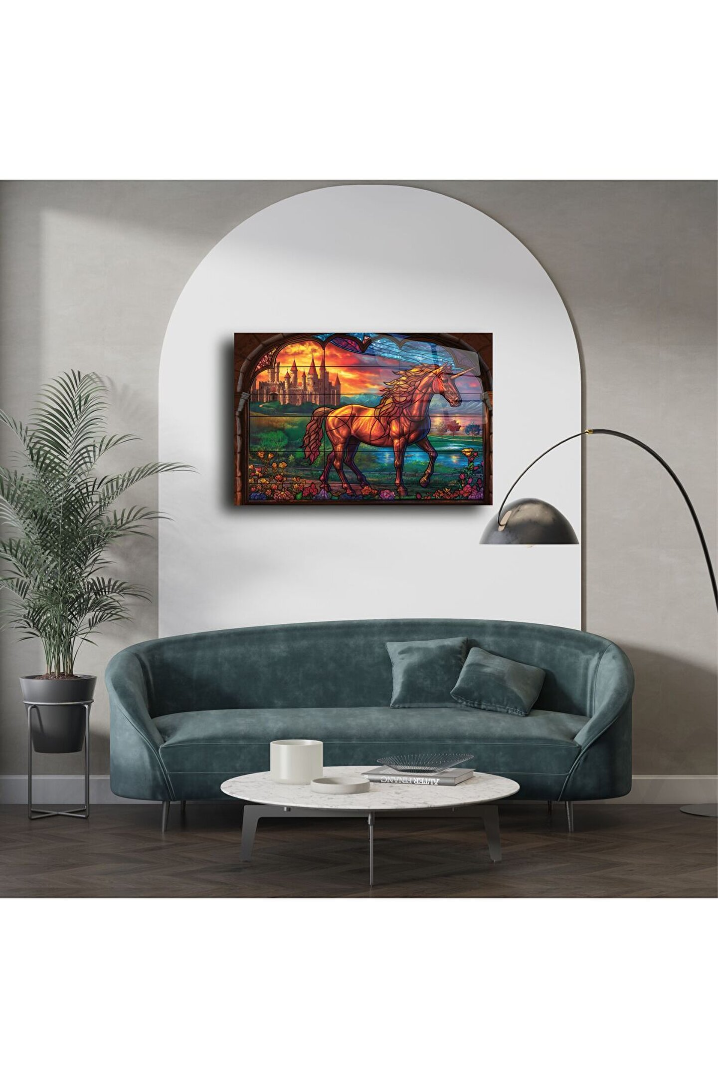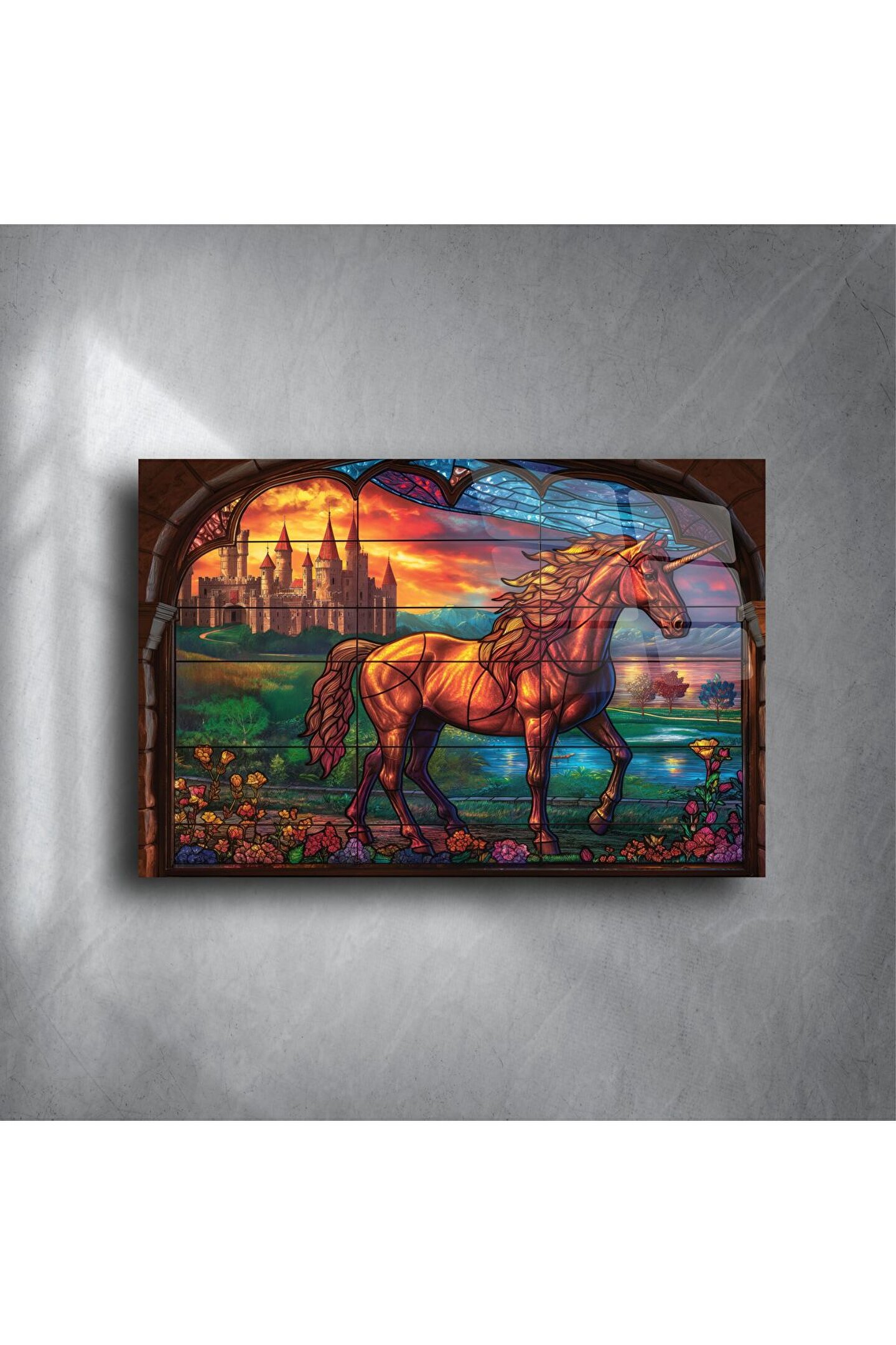 Bu büyülü cam tablo, gökkuşağı renkleriyle ışıldayan tek boynuzlu at ve uzaklarda yükselen görkemli kale manzarasıyla bir masal diyarını odanıza taşıyor. Zarif vitray efekti, tabloya hem nostaljik hem de fantastik bir estetik katıyor.