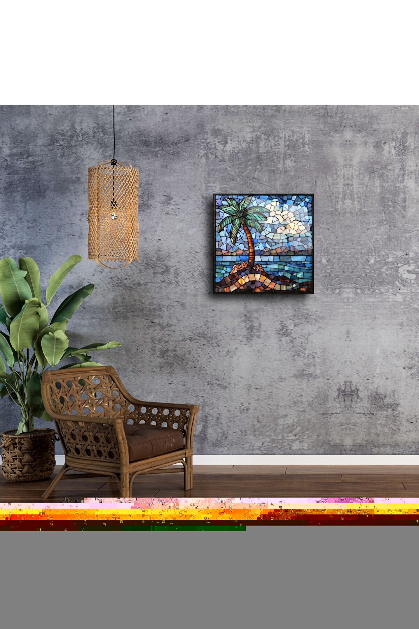 Bu göz alıcı tropikal palmiye ağaçlı cam tablo, yaz ruhunu ve sahil esintisini duvarlarınıza taşır. Vitray etkili renk geçişleri, okyanus mavisi ve doğal tonlarla birleşerek huzurlu bir atmosfer yaratır.