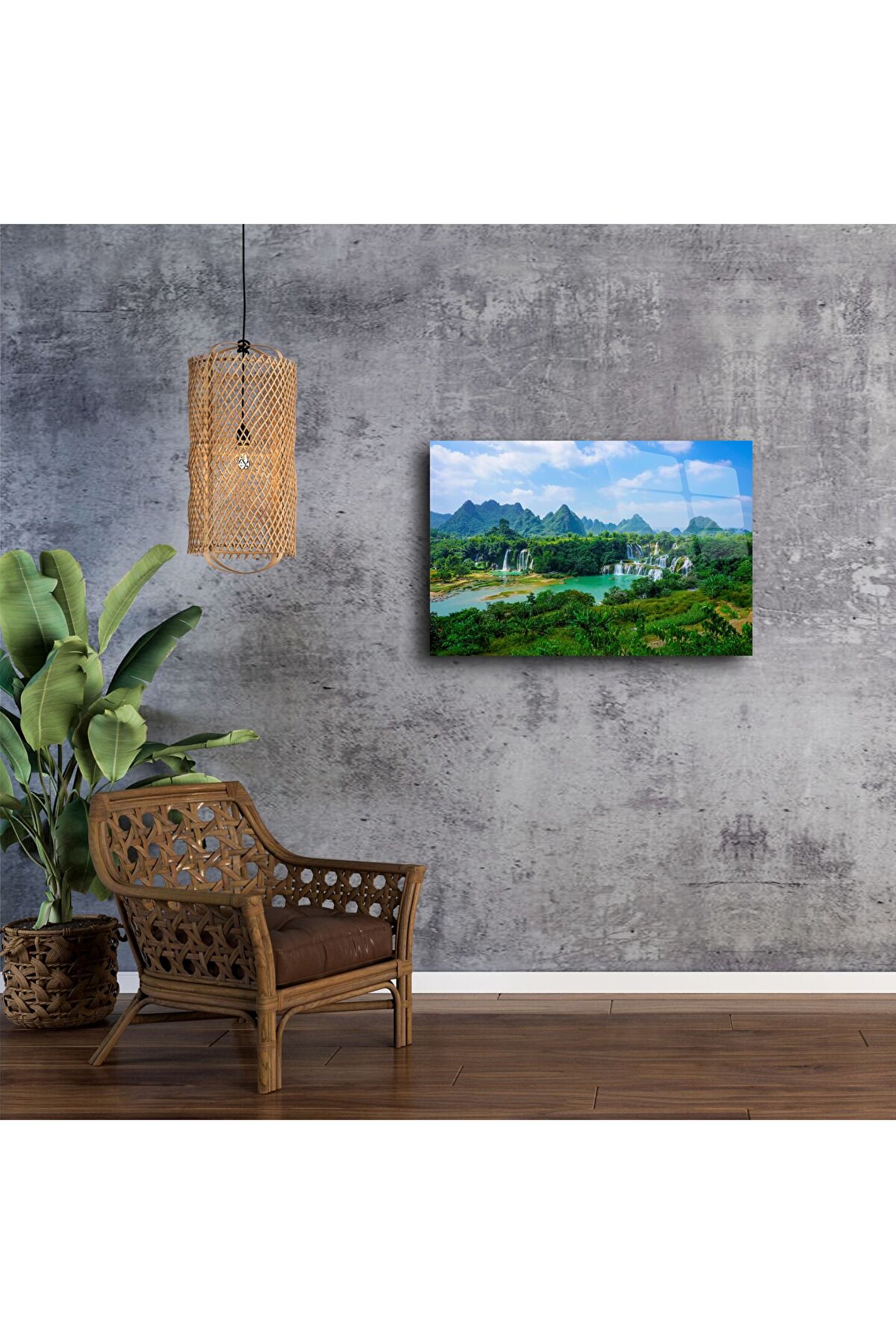 Doğanın en huzur verici haliyle buluşun: Şelalelerin coşkusu, yemyeşil doğa ve masmavi gökyüzü bu muhteşem cam tabloda hayat buluyor. Tropikal doğa manzarasını evinizin ya da ofisinizin duvarına taşıyan bu tasarım, canlı renkleri ve detaylı baskısıyla büyüleyici bir atmosfer sunar.
