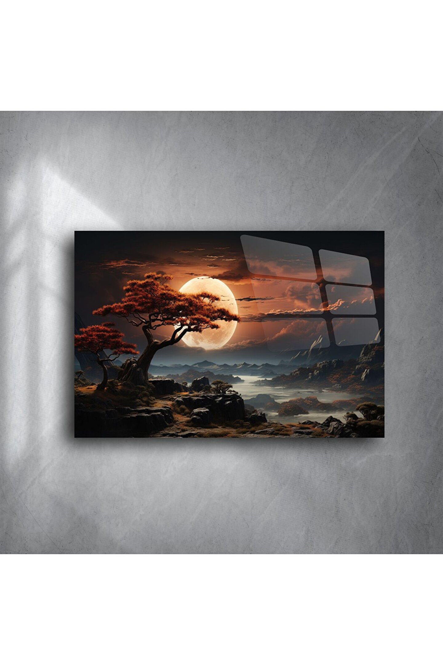 Büyüleyici turuncu ay ışığı altında kıvrılan siluet ağaçları ve sisli dağ manzarasıyla bu cam tablo, doğaya duyduğunuz tutkuyu duvarlarınıza taşıyor. Yüksek çözünürlüklü baskı teknolojisi ile üretilen bu modern duvar sanatı, ışığı yansıtan parlak cam yüzeyiyle odanıza sofistike bir atmosfer katıyor.