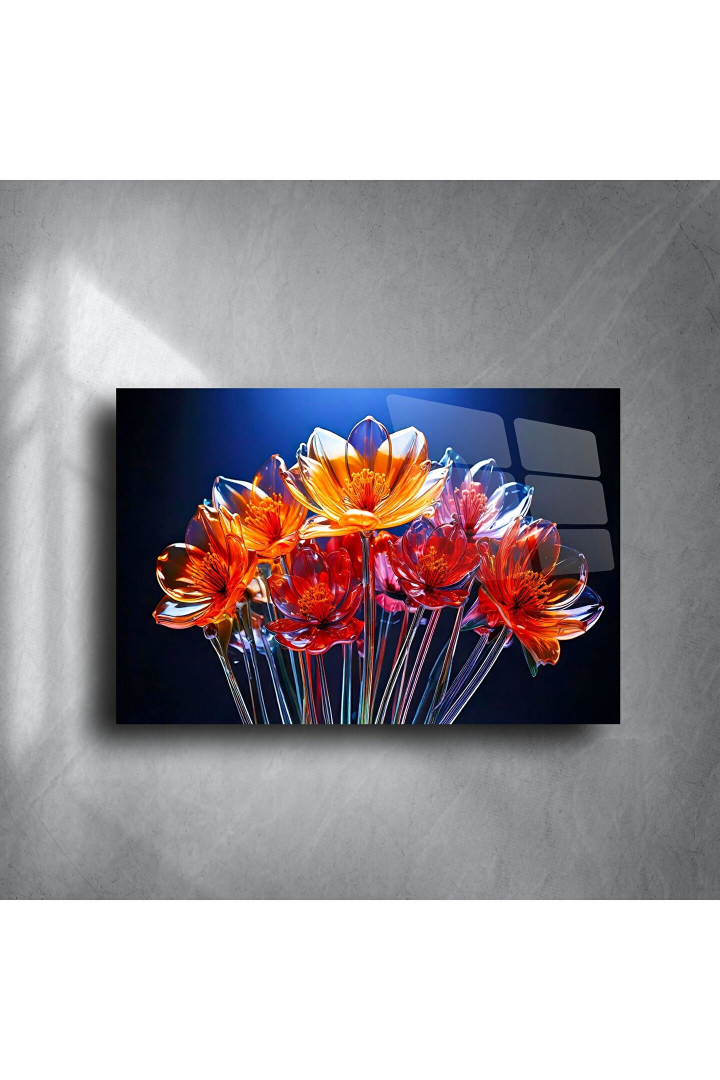 Bu etkileyici cam tablo, gece fonu üzerinde ışıldayan cam çiçek buketiyle büyüleyici bir atmosfer yaratıyor. Parlak cam yüzey ve derinlikli 3D çiçek formu, izleyeni içine çeken zarif bir sanat eserine dönüşüyor.