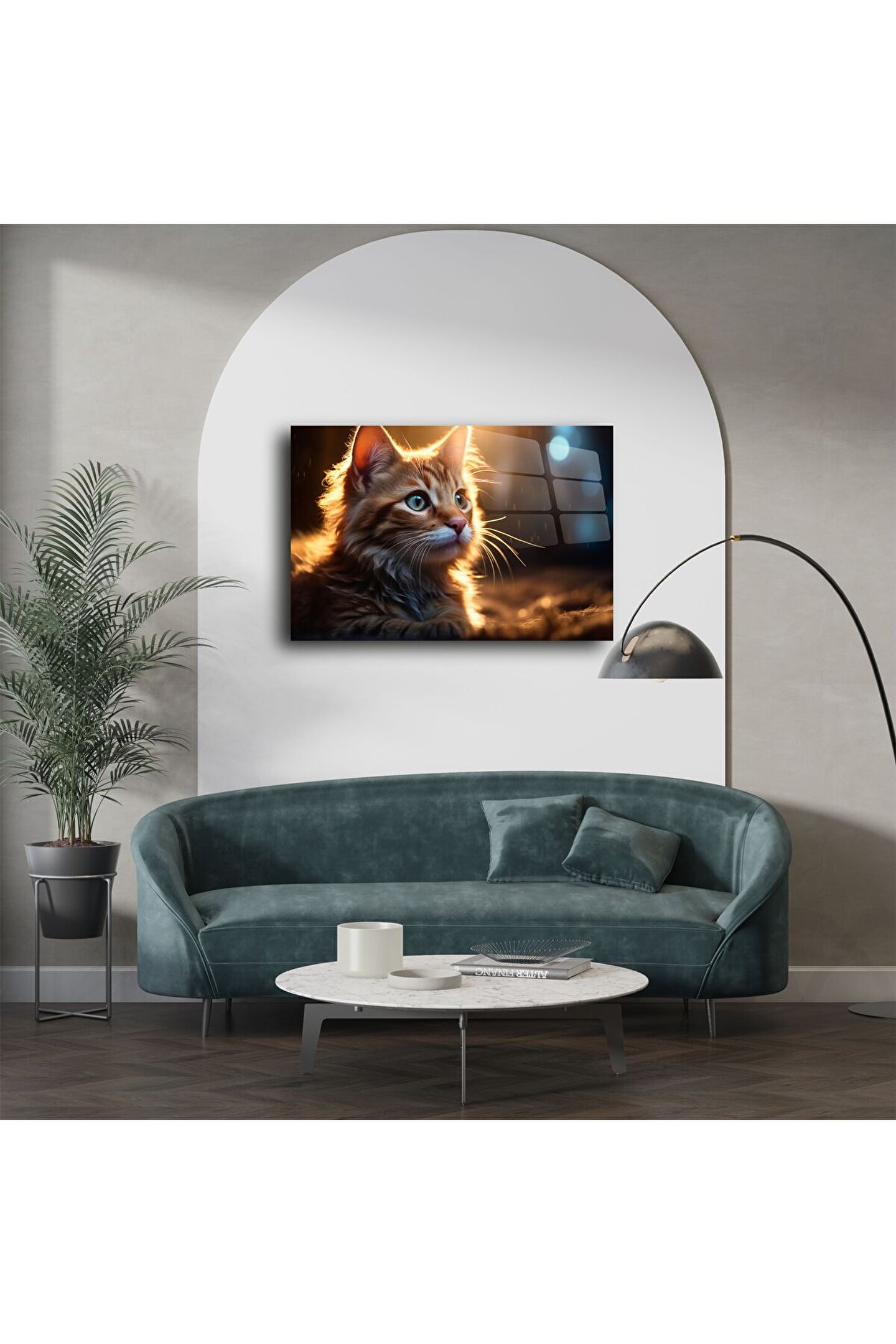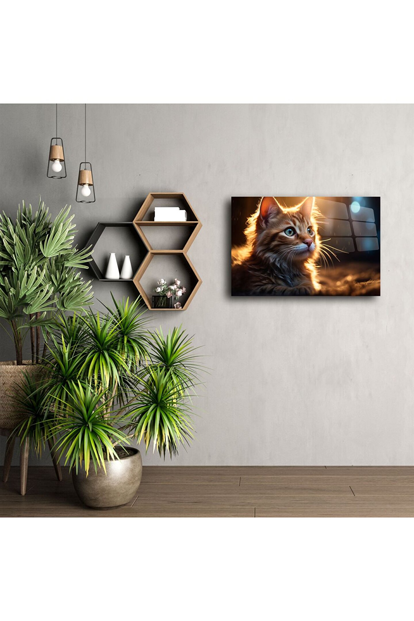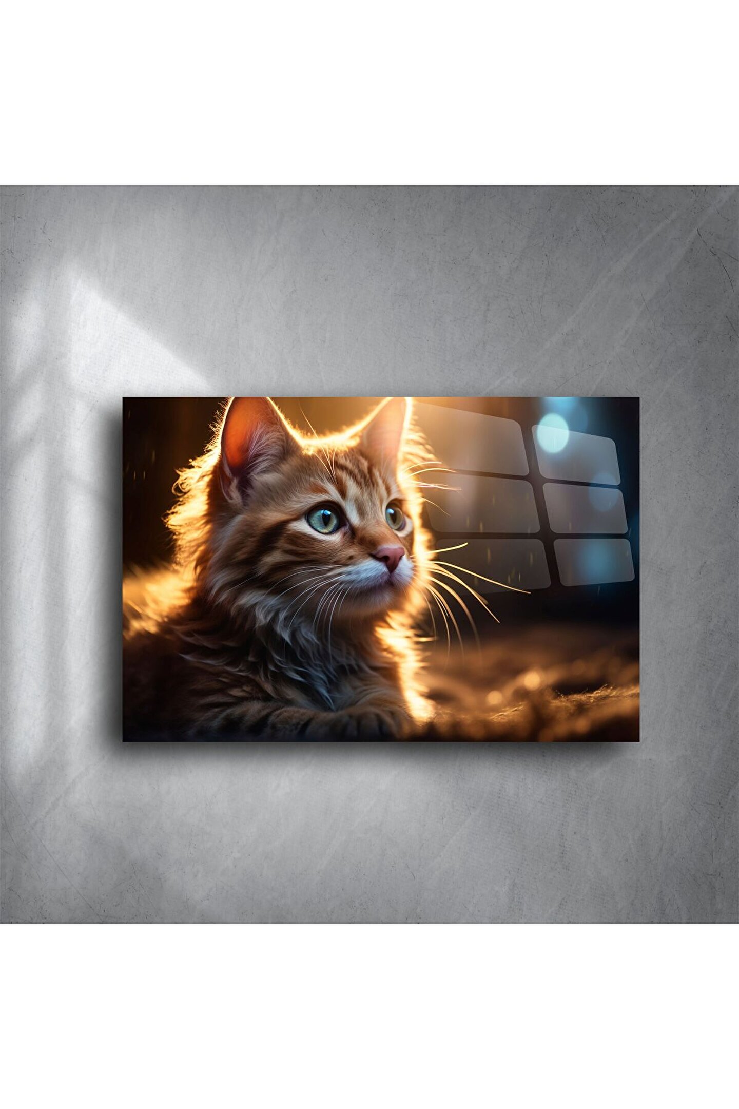 Bu turuncu yavru kedi cam tablo, gün batımının sıcak ışığını minik bir kalbin içine sığdırıyor. Işığın kürkte oluşturduğu parıltı ve kedinin hayran bakışları, yüksek çözünürlükle temperli cam yüzeyeişlenerek huzur dolu bir dekorasyon sunar.