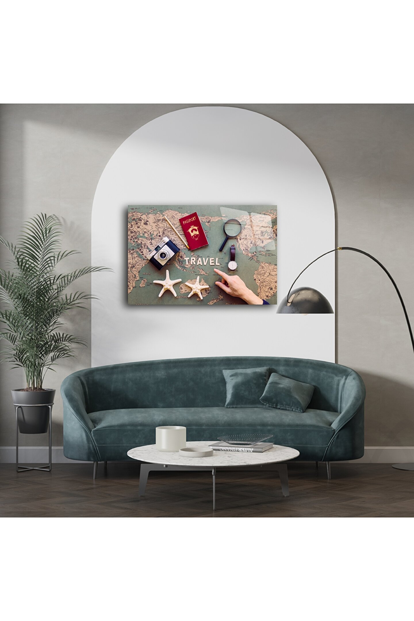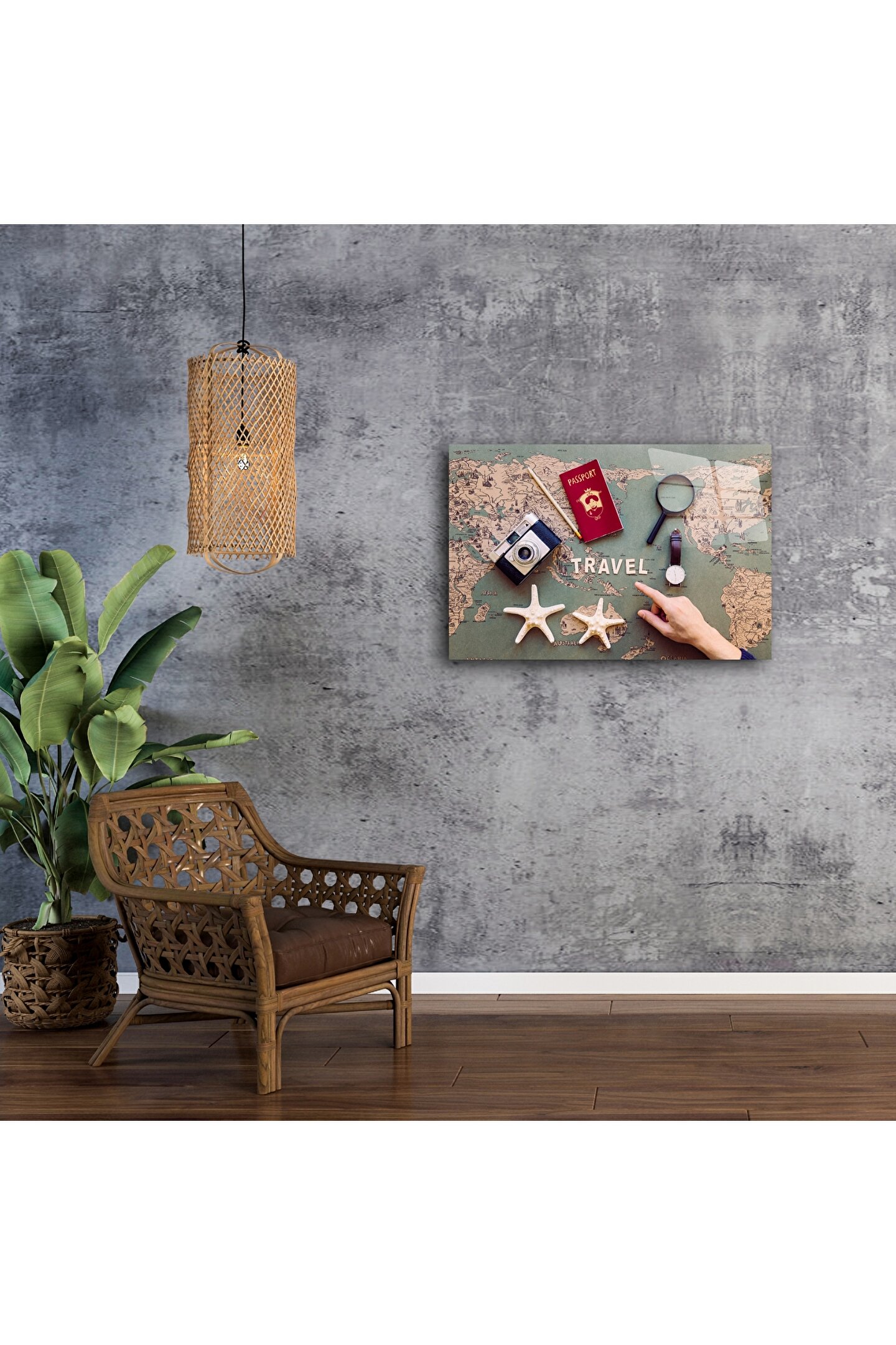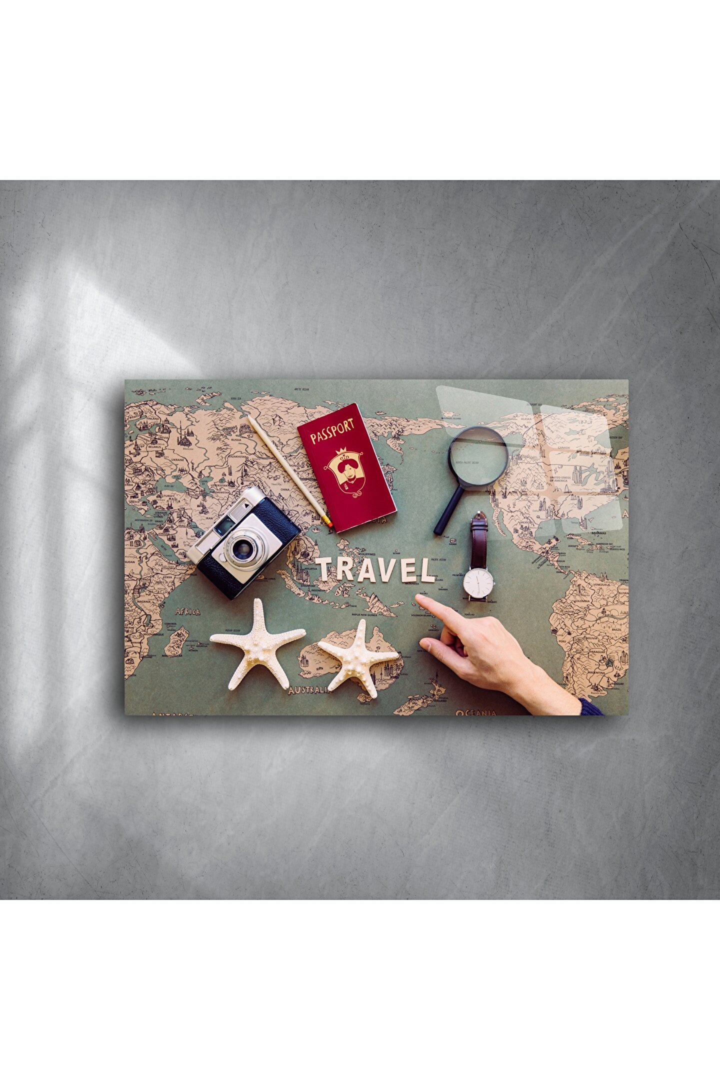 Seyahat ruhunu evinizin duvarlarına taşıyın! Bu cam tablo, vintage dünya haritası üzerinde konumlandırılmış pasaport, retro fotoğraf makinesi ve deniz yıldızlarıyla tamamlanmış sofistike bir kompozisyon sunar. Her detay, keşfetme arzusunu ve uzaklara duyulan özlemi simgeler.