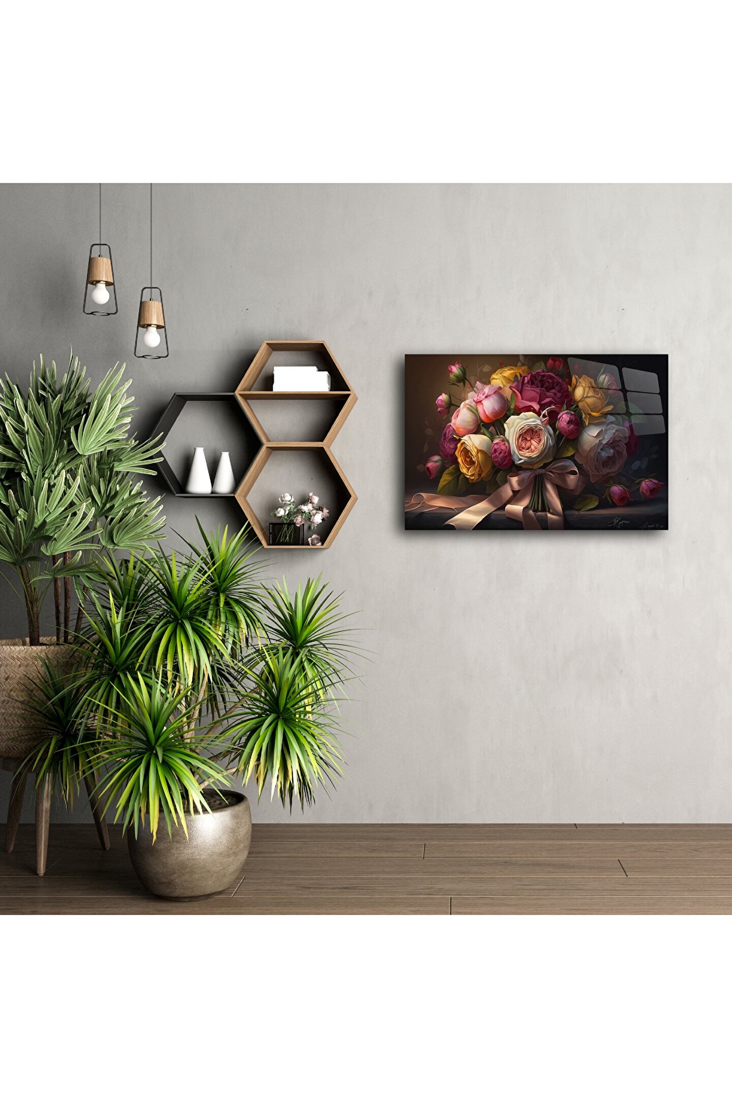 Romantik gül buketi sanat posteri, çiçeklerin duygusal zarafetini evinize taşıyor. Yüksek çözünürlüklü dijital illüstrasyon, nostaljik vintage dokunuşla birleşiyor. Her bir detay, renkli çiçeklerin hayat dolu enerjisini ve incelikli romantizmini yansıtıyor – ister sevgi dolu bir hediye ister ruhunuzu yansıtan bir duvar parçası olarak tercih edin.
