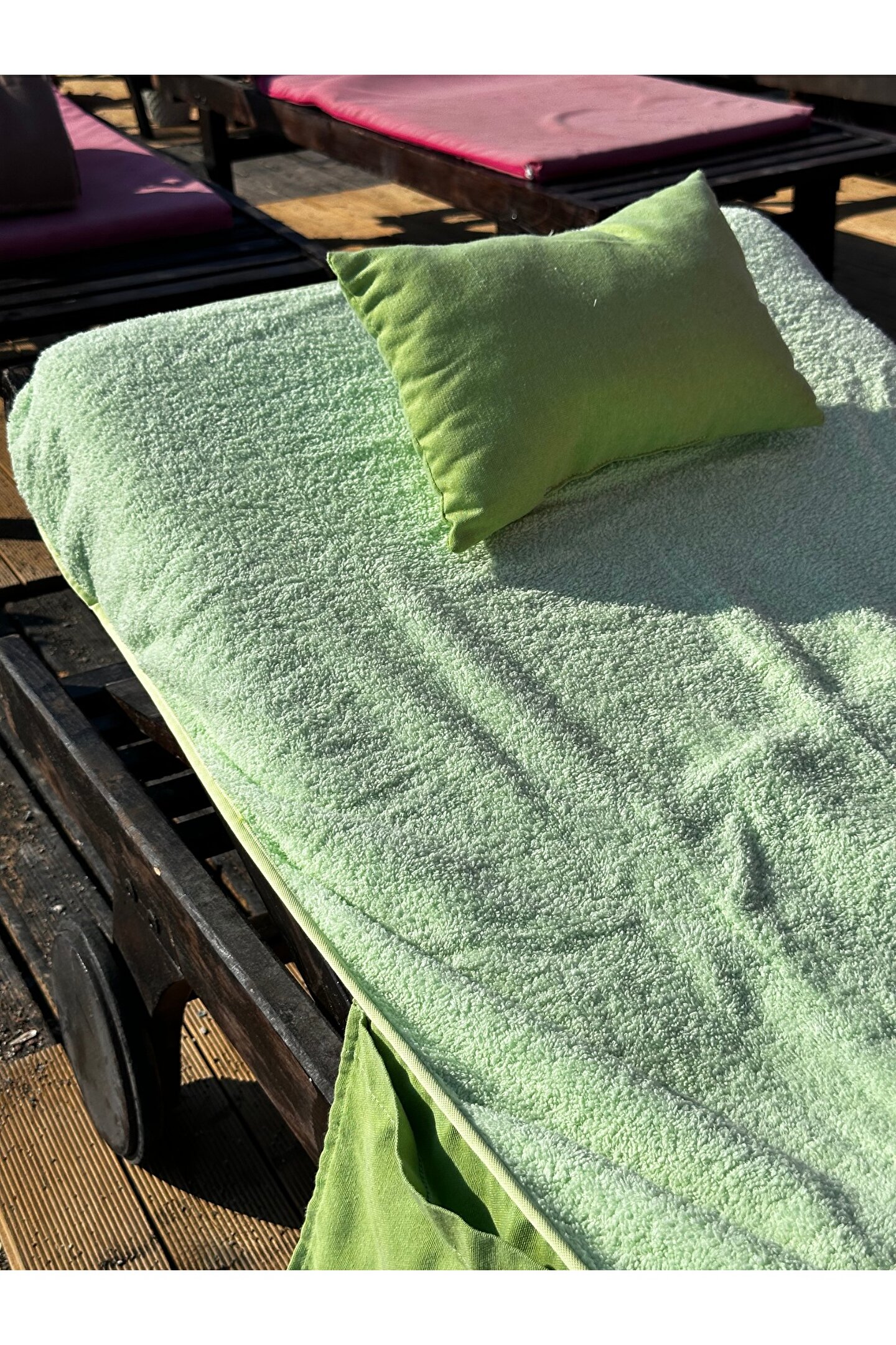 Çanta formunda plaj havlusu Ürün içerisinde yastığı ile gönderilmektedir. ; Ürünün çanta formunda iken 4, açık formda iken de 4 cebi bulunmaktadır. ; Ceplerde cüzdan, telefon, anahtar, kitap gibi bütün özel eşyalarınızı rahatlıkla muhafaza edebilirsiniz. ; Şezlonga sabitlemek için ipi bulunmaktadır. ; Aynı zamanda içinden çıkan yastık rüzgardan uçmaması ve kolay kullanım için istendiğinde düğme ile sabitlenebilmektedir. ; Çamaşır makinasında yıkamaya uygundur. ; Ürün üzerindeki çanta detayı dikme formdadır. ; Ürün açılıp şezlonga serildiğinde çanta detayı altta kalıp kolay kullanım sağlar. ; 75x175 cm;