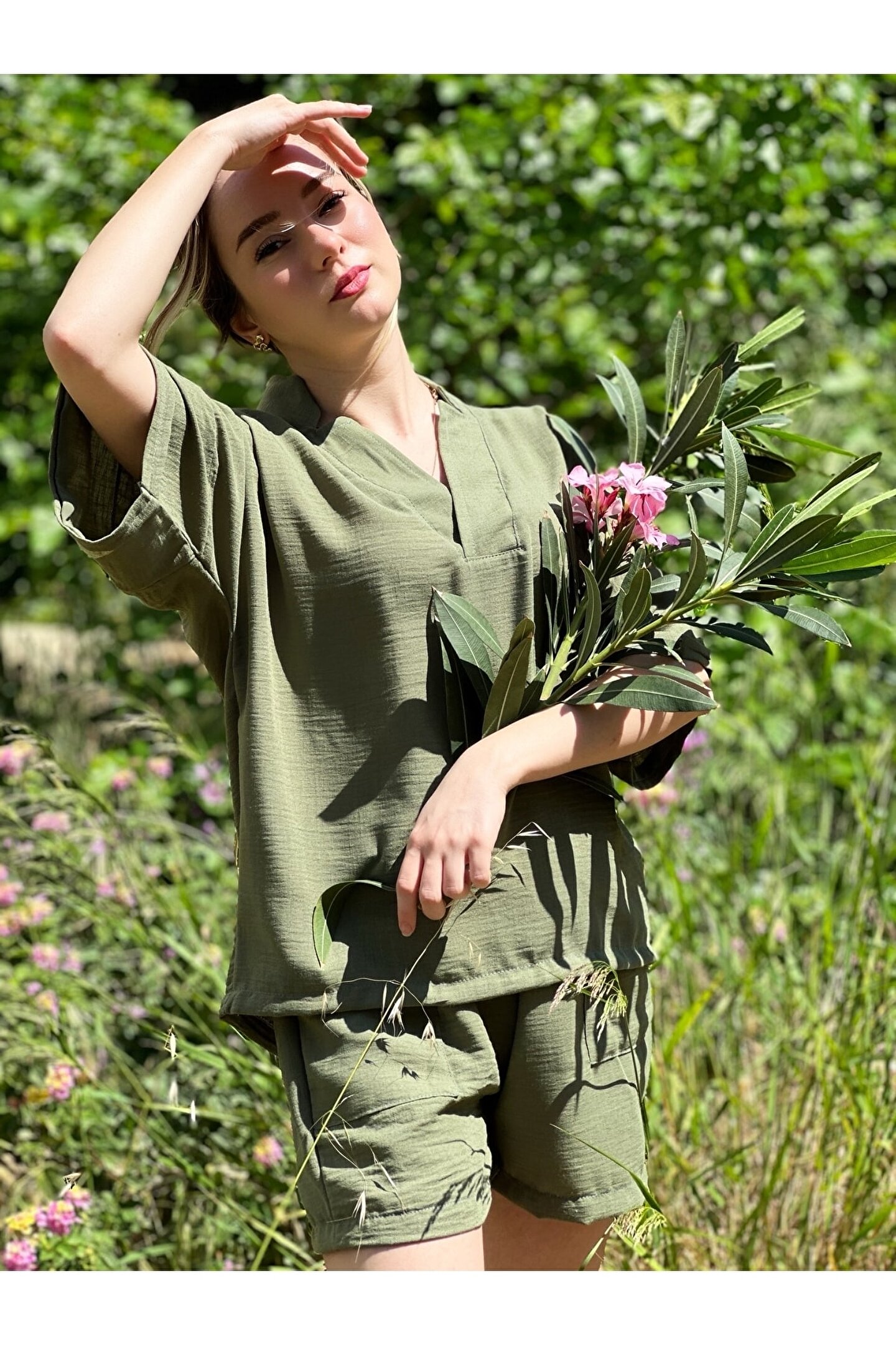 Truvakar kol tasarımı ile modern ve şık bir görünüm sunar; Günlük kullanıma uygun rahatlığı ve konforu bir arada sunan casual tarzda tasarlanmıştır; Dokuma kumaş yapısı sayesinde dayanıklılık ve nefes alabilirlik sağlar; V yaka kesimi ile sade ve zarif bir stil oluşturur; Çift cepli tasarımı pratik kullanım imkanı sunarken, eşyalarınız için güvenli bir alan sağlar; Lastikli bel detayı sayesinde rahat bir oturuş ve hareket özgürlüğü sağlar; Basic koleksiyonun sadeliğiyle her ortama uyum sağlayacak şekilde tasarlanmıştır; Geniş paça kesimiyle modern ve trend bir siluet çizer; Beli lastikli yapısı konforlu bir kullanım sunarken, vücut hatlarını nazikçe sarar; Oversize kalıbı rahatlığı ön planda tutarak geniş ve rahat bir kullanım imkanı tanır; Basic siluetiyle zamansız bir şıklık yaratır; her mevsim tercih edilebilir; Keten materyali hafifliği ve doğal dokusuyla;