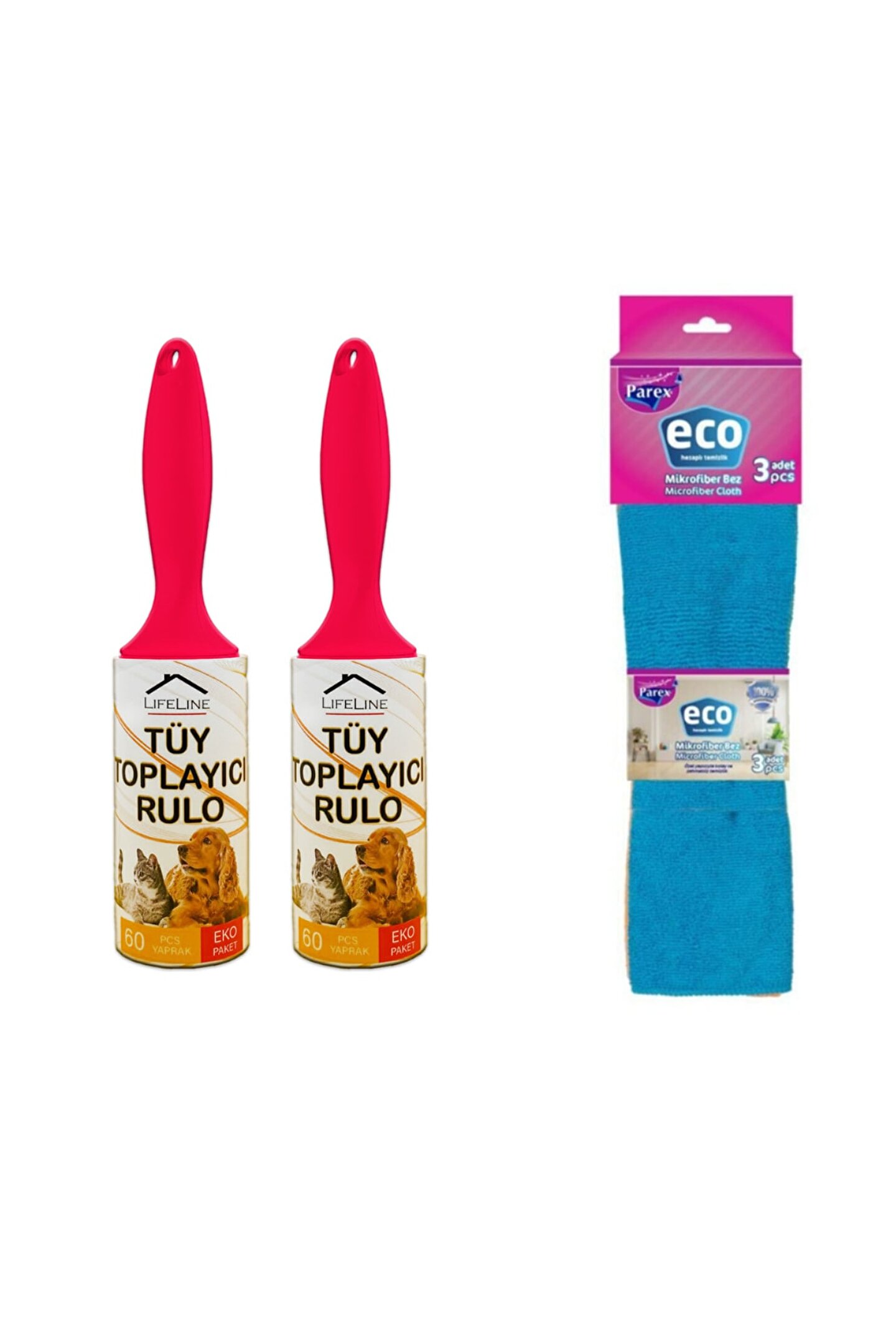 2 Adet Life Line Tüy Toplayıcı Rulo 60 Yapraklı 7,3 mt ; 1 Paket Parex Eco Mikrofiber Genel Temizlik Bezi 3'lü (25 x 35 cm ölçülerinde ) ;