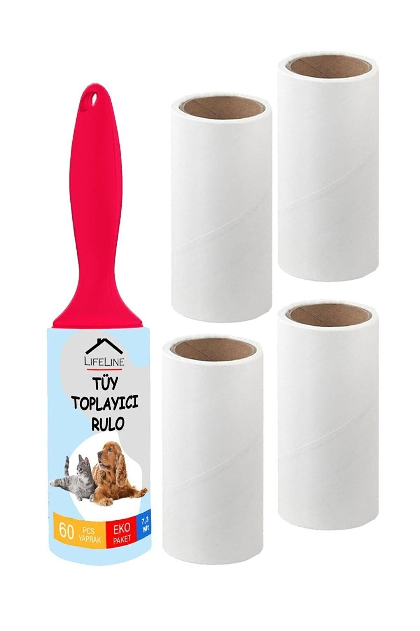 Life Line Eko Tüy Toplayıcı Rulo + 4 Adet Yedek Rulo Bu ürün 1 adet tüy toplayıcı rulo ve 4 adet yedek rulodan oluşmaktadır.; ; Şık ve ergonomik dizayna sahip yapısıyla kolay ve rahat kullanım sağlar.; ; Her bir yedek rulo, kirlendiğinde kolayca değiştirilebilen 40 yapışkan kağıda sahiptir.; ; Kendinden yapışkanlı özel dokusu ile saç, tüy, ufak parçacıklar, kedi tüyleri ve köpek tüylerini kıyafetlerden , koltuklardan ve diğer tüm yüzeylerden kolayca zahmetsizce ve anında kolaylıkla temizler.; ; Life Line Tüy Toplayıcı Rulolar Sadece Life Line Marka Yedek Rulolarla Kullanılabilir.; ;