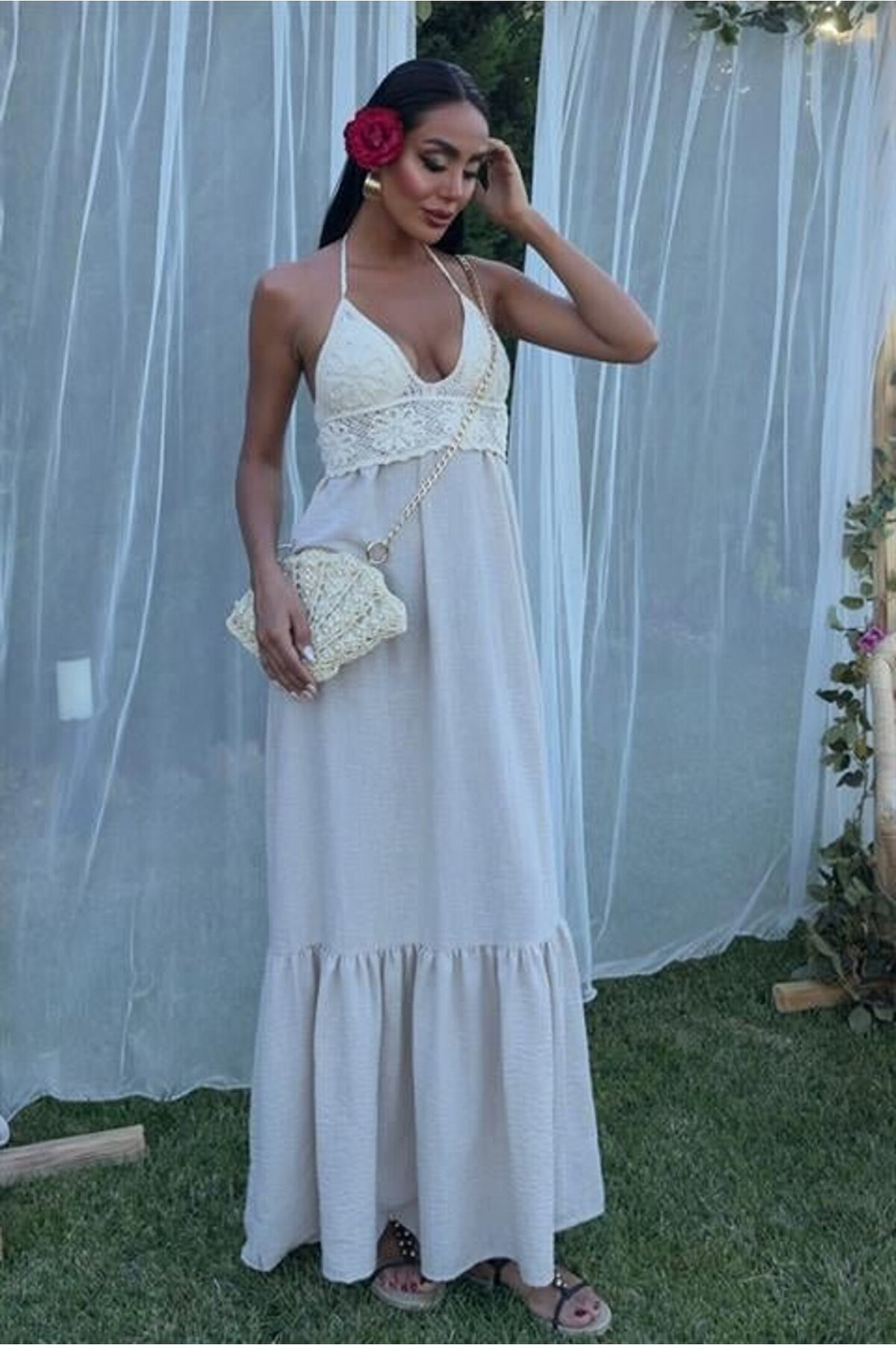 EQURİ Göğsü Trikolu Keten Uzun Elbise 2904-08