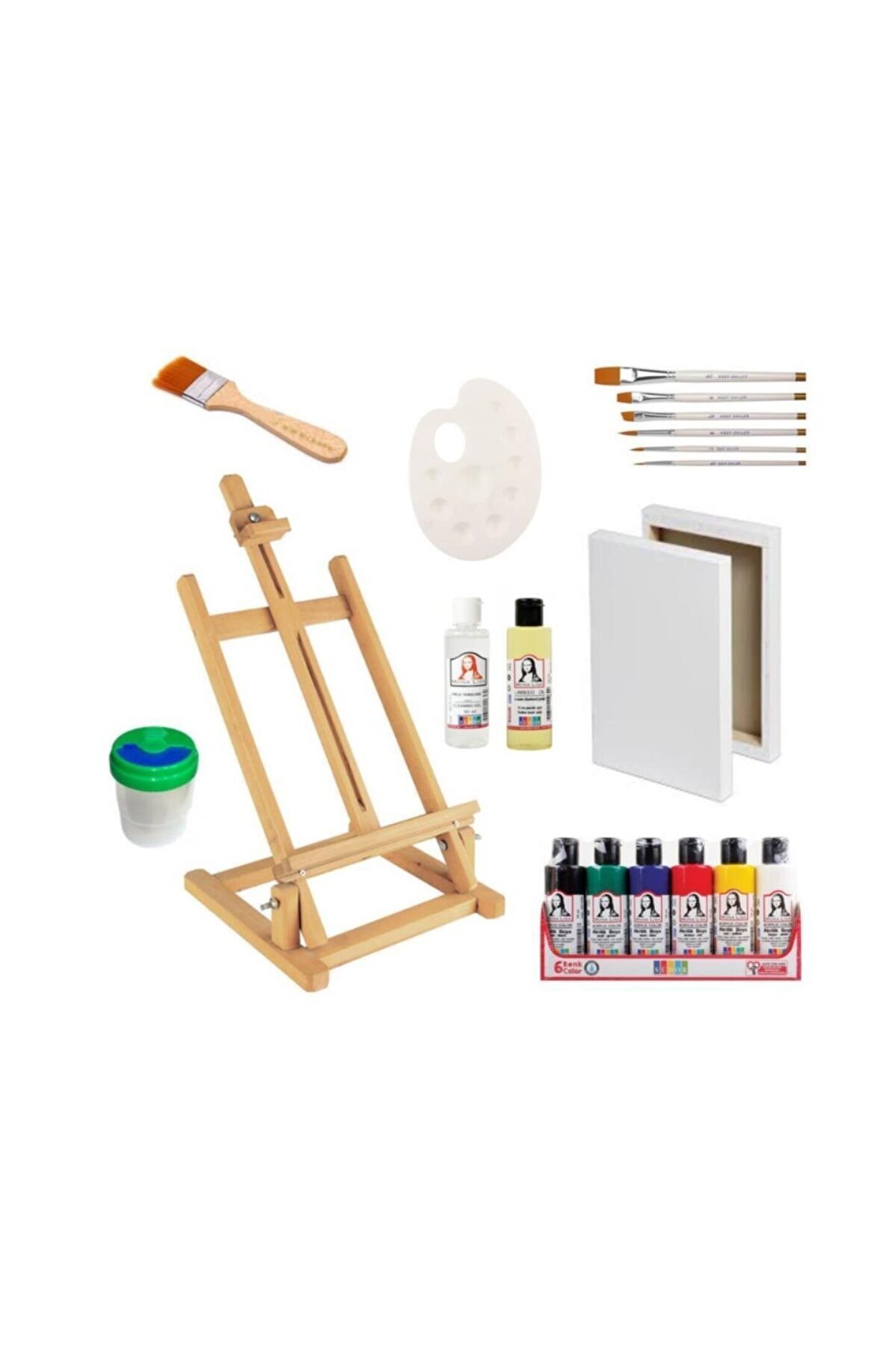 Masaüstü ahşap şövale tuval 35x50 cm südor akrilik boya 70 ml. ; X 6 renk sivri uçlu fırça 3 adet yassı uçlu fırça 3 adet zemin fırça 1 adet fırça temizleme sıvısı 100 ml. ; Resim yağı 100 ml. ; Fırça temzileme kabı plastik palet godeli;