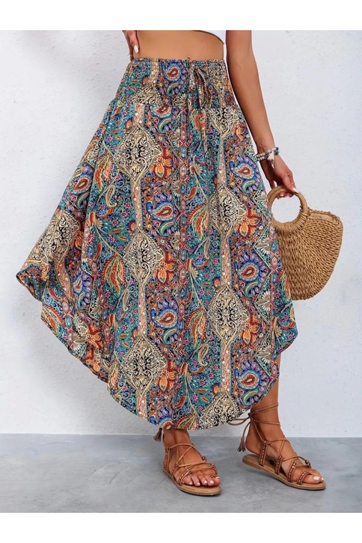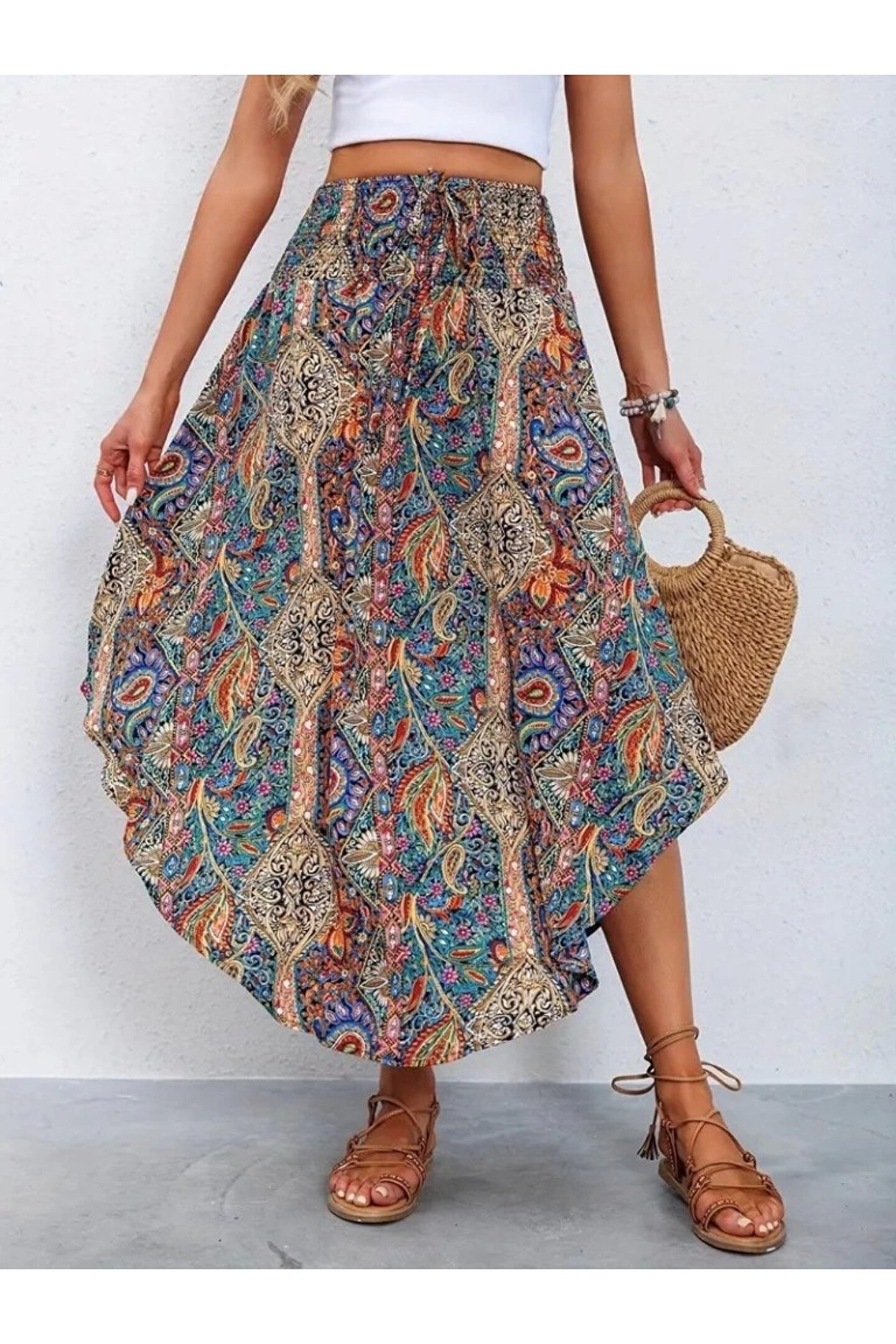 Kadın Beli Lastikli Bağcıklı Asimetrik Kesim Detaylı Desenli Bürümcük Etek