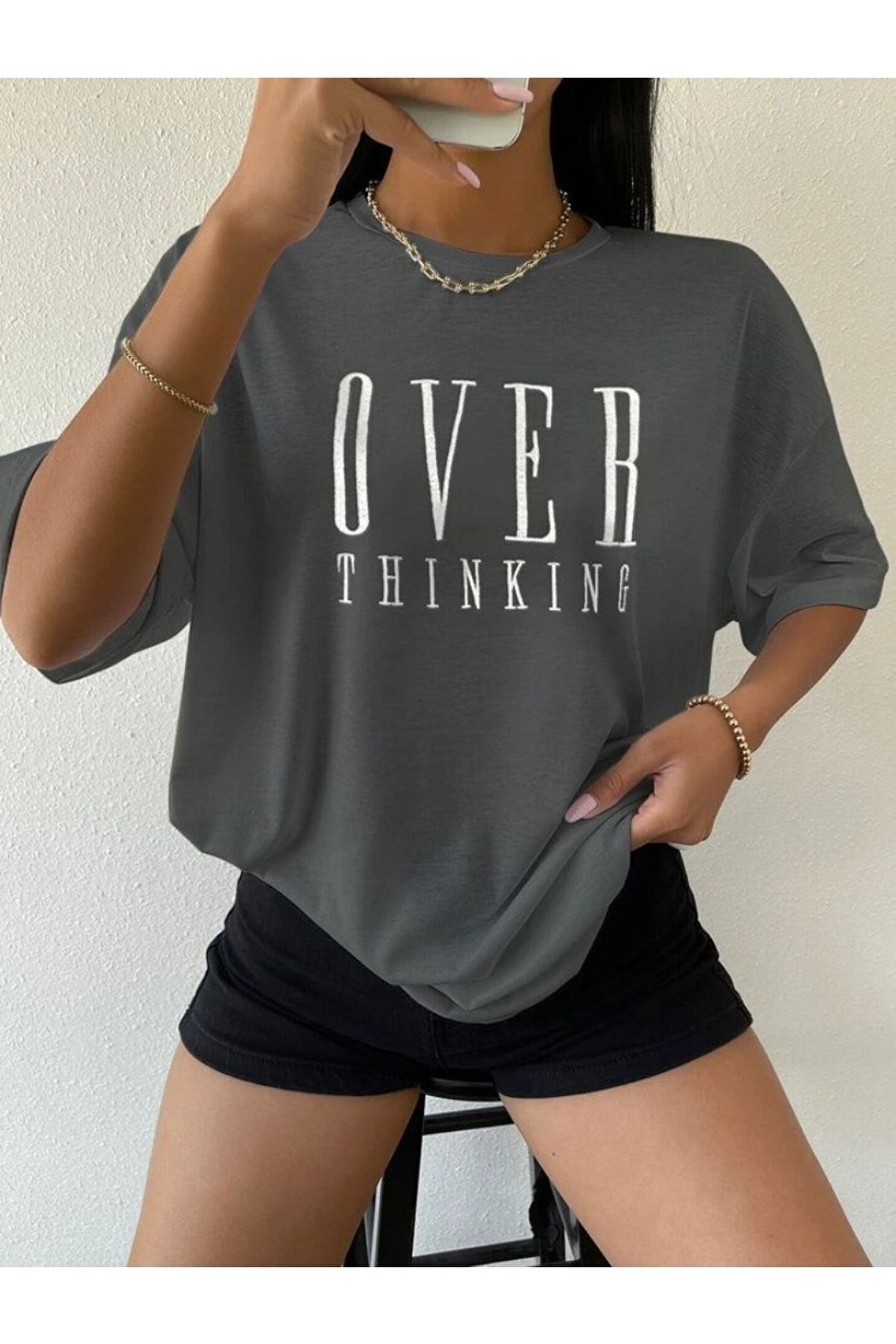 Kadın Oversize Over Thinking Baskılı Antrasit Tshirt