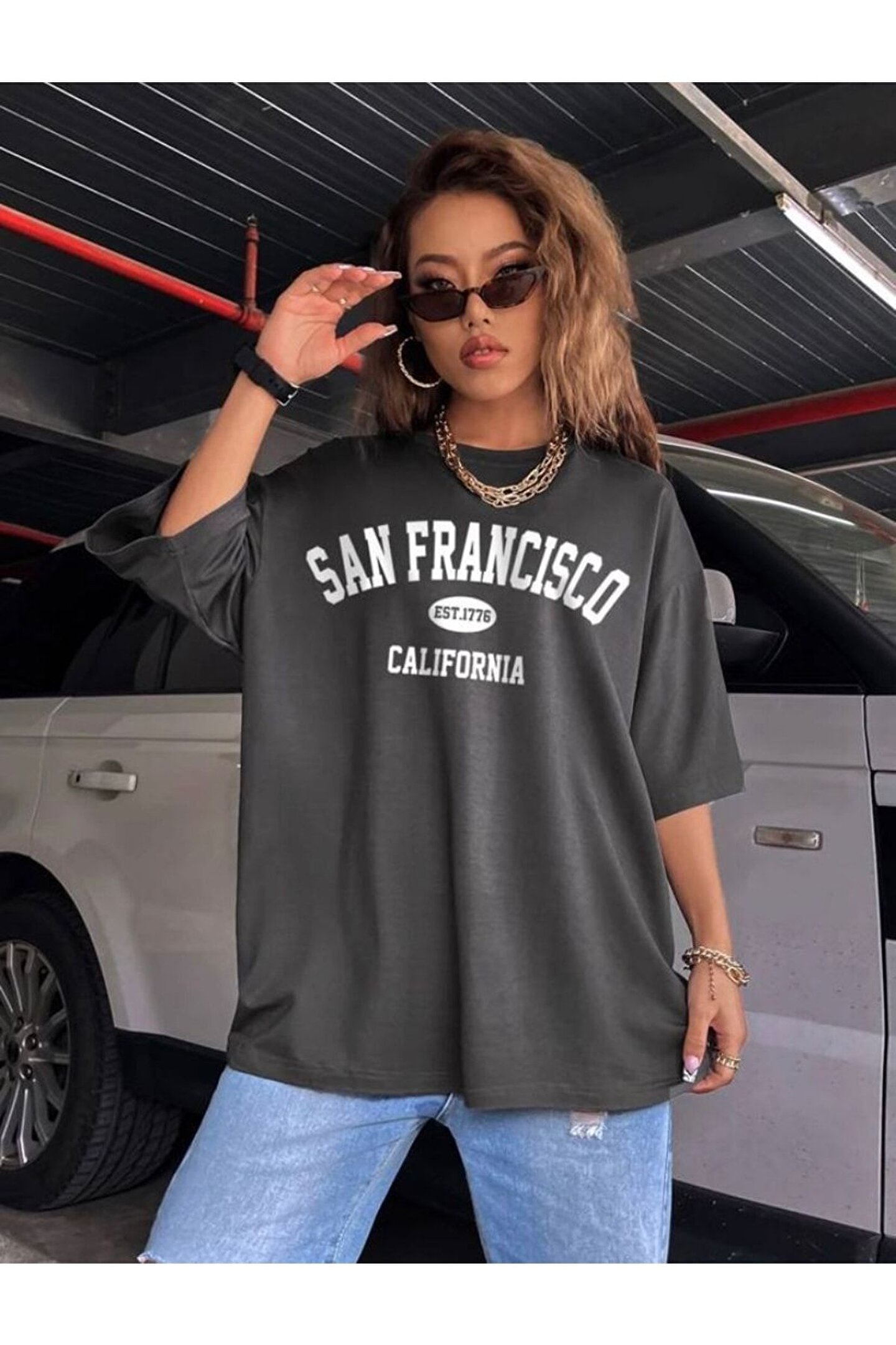 Kadın Oversize San Francisco Baskılı Antrasit Penye Tshirt