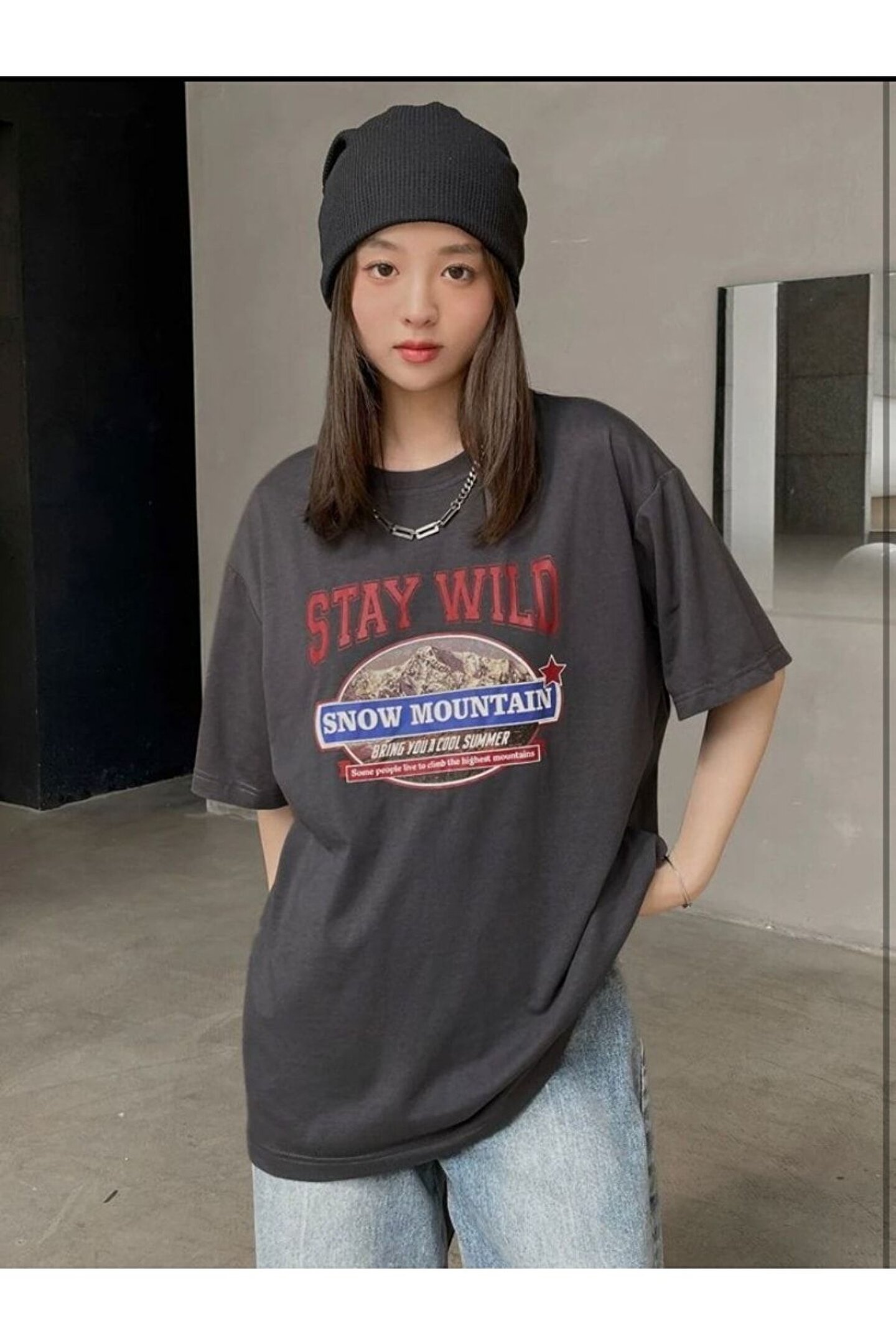 Kadın Oversize Snow Mountain Baskılı Antrasit Penye Tshirt