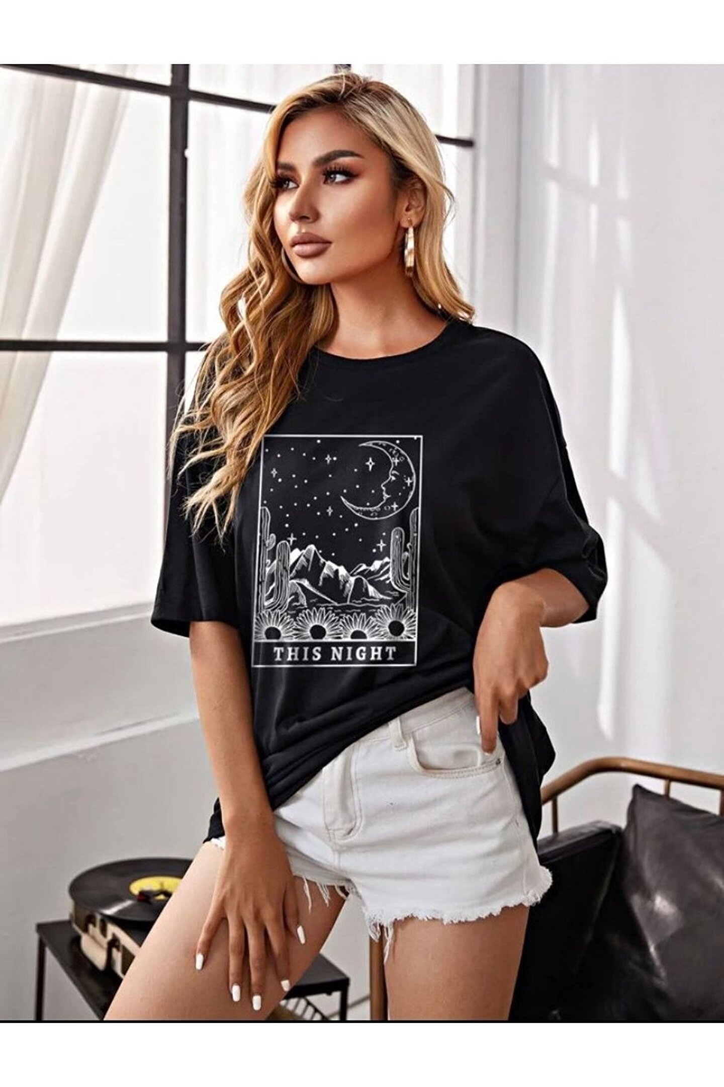 Kadın Oversize This Night Baskılı Siyah Tshirt