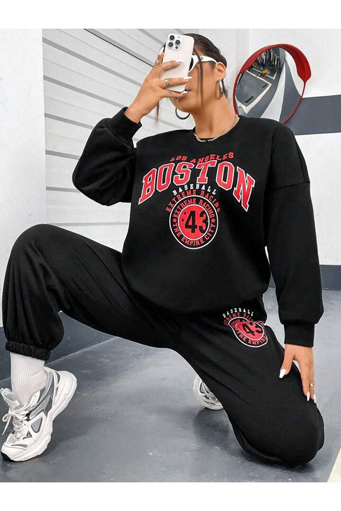 Kadın Siyah Boston Baskılı Bisiklet Yaka Sweatshirt-Eşofman Takım