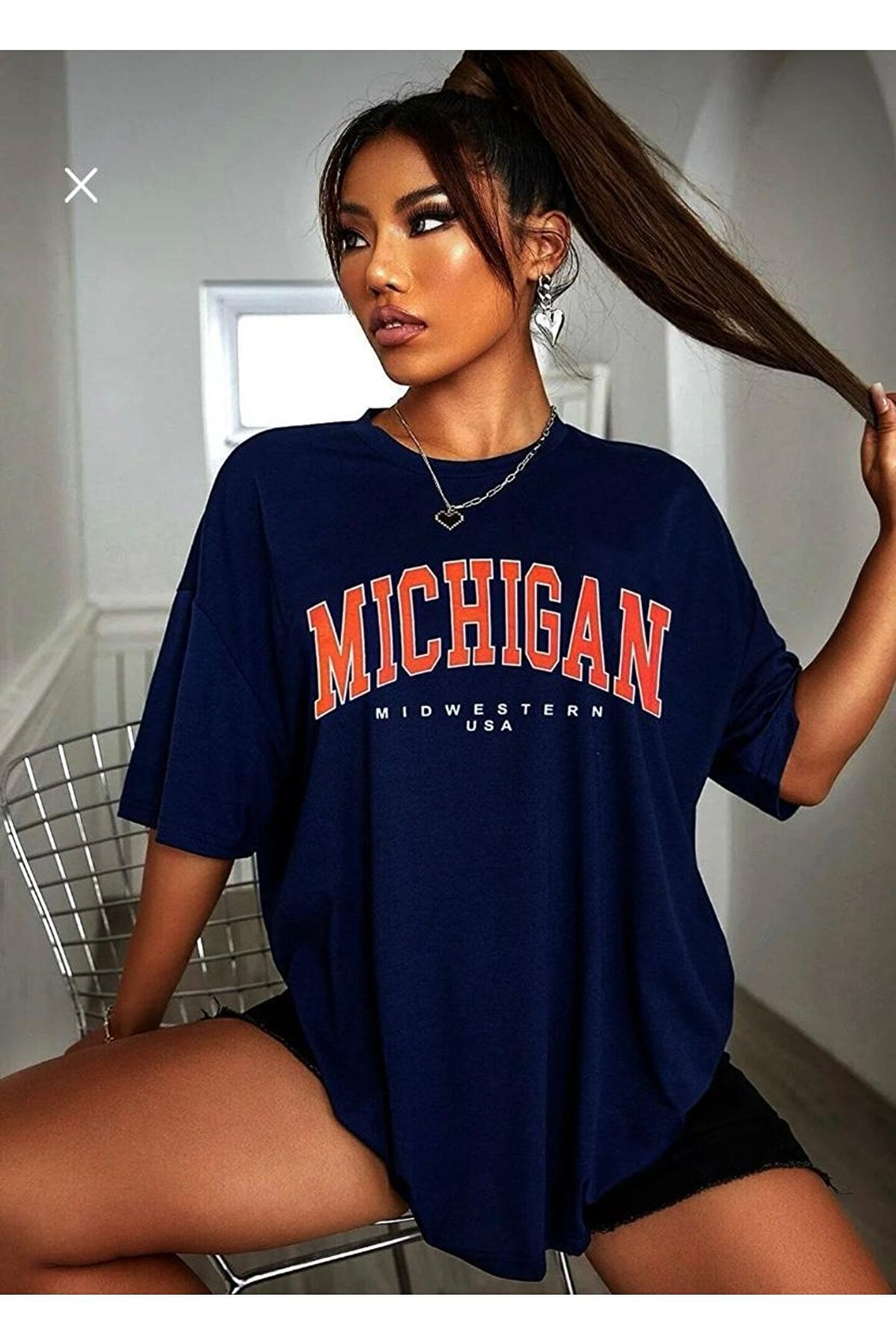 Oversize Unisex Michigan Baskılı Lacivert Tshirt
