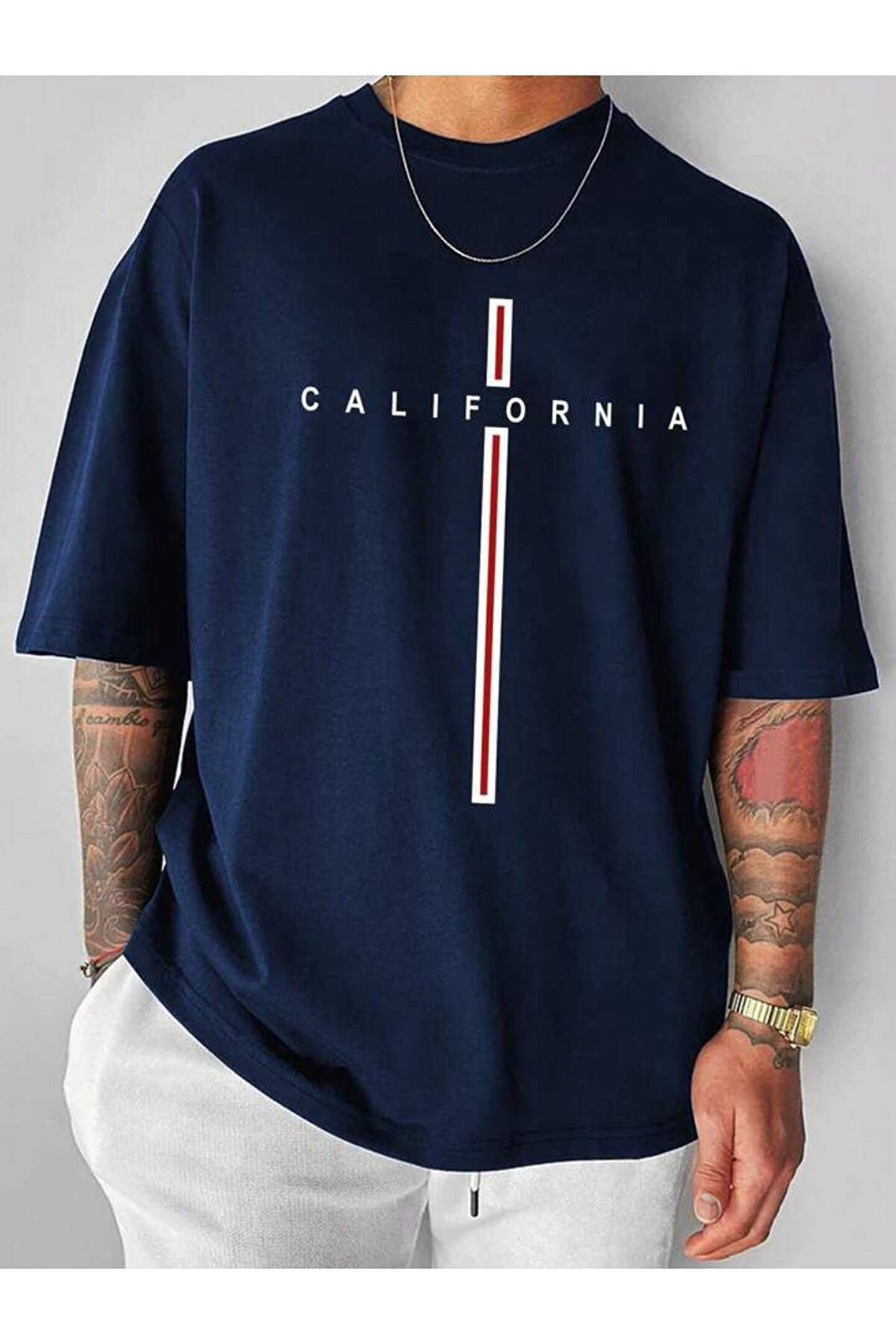 Unisex Lacivert California Baskılı Bisiklet Yaka Oversize Tişört