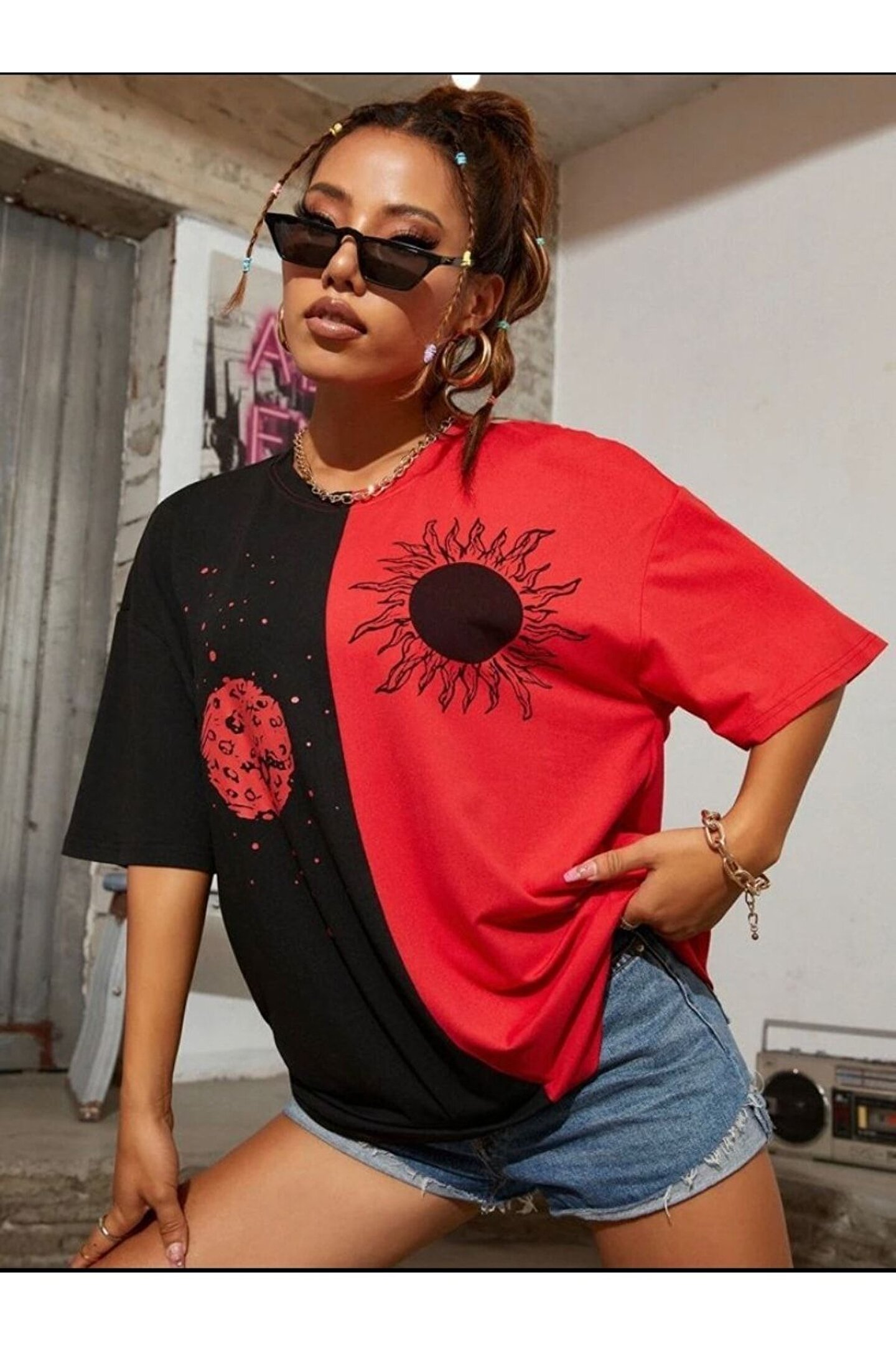 Unisex Oversize Kırmızı-siyah Sun Moon Baskılı Çift Renk Tshirt