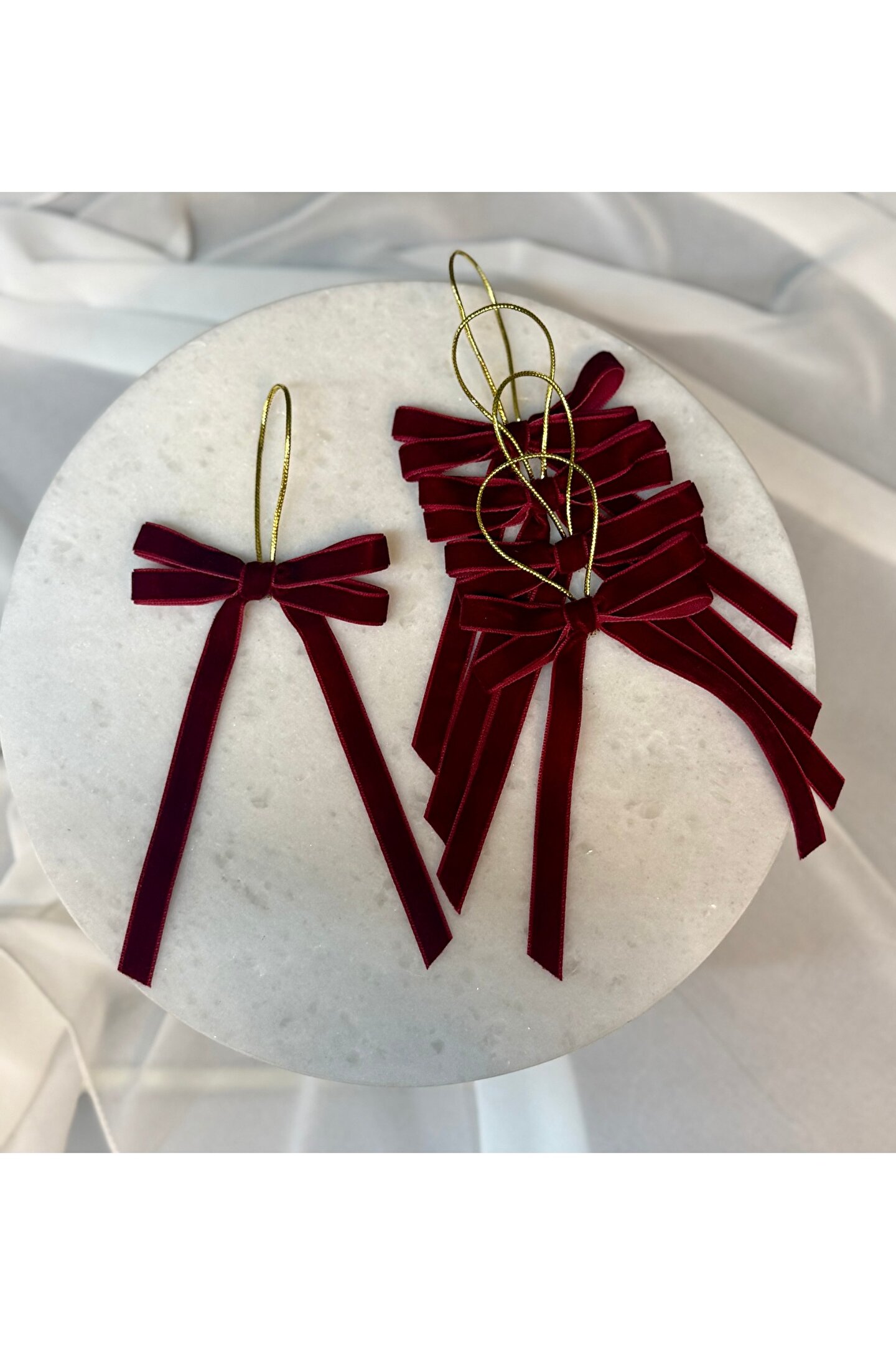 Şık ve zarif görünümüyle bordo kadife el yapımı fiyonklar, yılbaşı dekorasyonu başta olmak üzere hediye paketleme, vitrin süsleme ve özel gün organizasyonlarında dekorlarınıza sıcak ve premium bir hava katar.; Yumuşak kadife dokusu sayesinde estetik ve kaliteli bir görünüm sunar.; ✔ El yapımıdır ✔ Kadife kurdeleden üretilmiştir ✔ Dekoratif ve hafif yapıdadır ✔ Yılbaşı ve dört mevsim dekorasyonlara uygundur