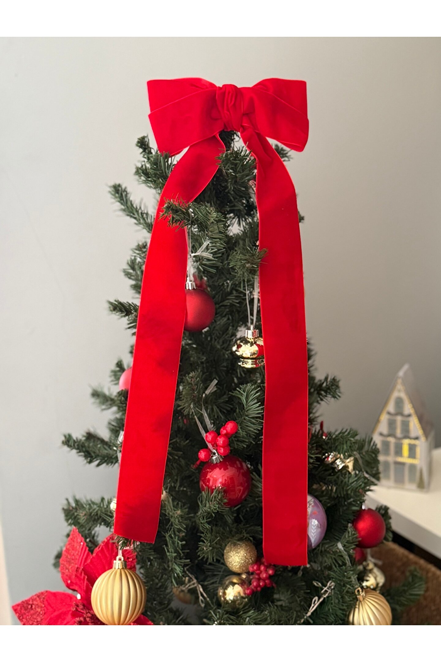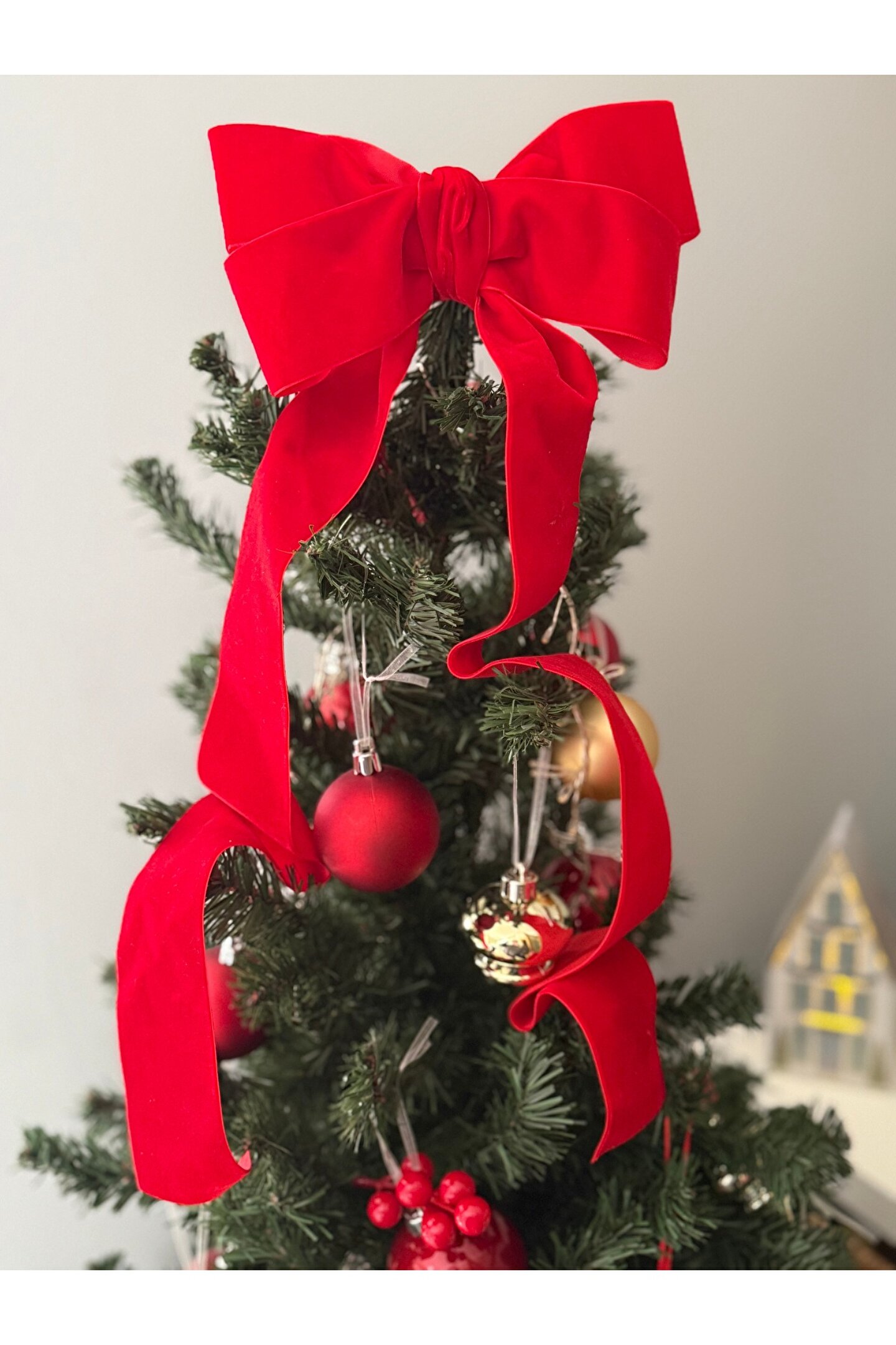 Lovein Atelier Büyük Kırmızı Kadife Fiyonk Kurdele Ağaç Süsü Yeni yıl,Yılbaşı,Dekor