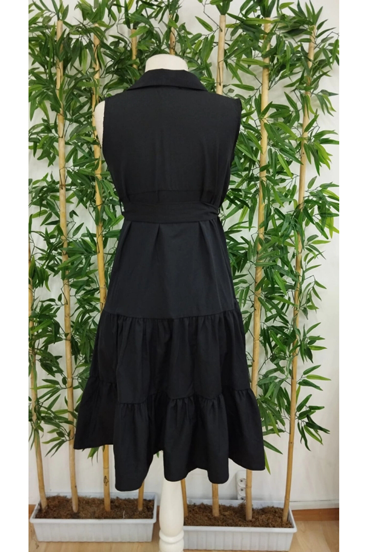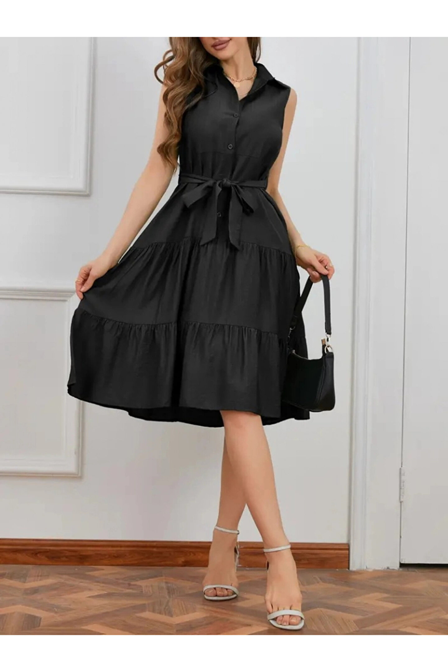 Kadın Kısa Kollu Gömlek Yaka Düğmeli Beli Kuşaklı Katlı Dokuma Midi Elbise