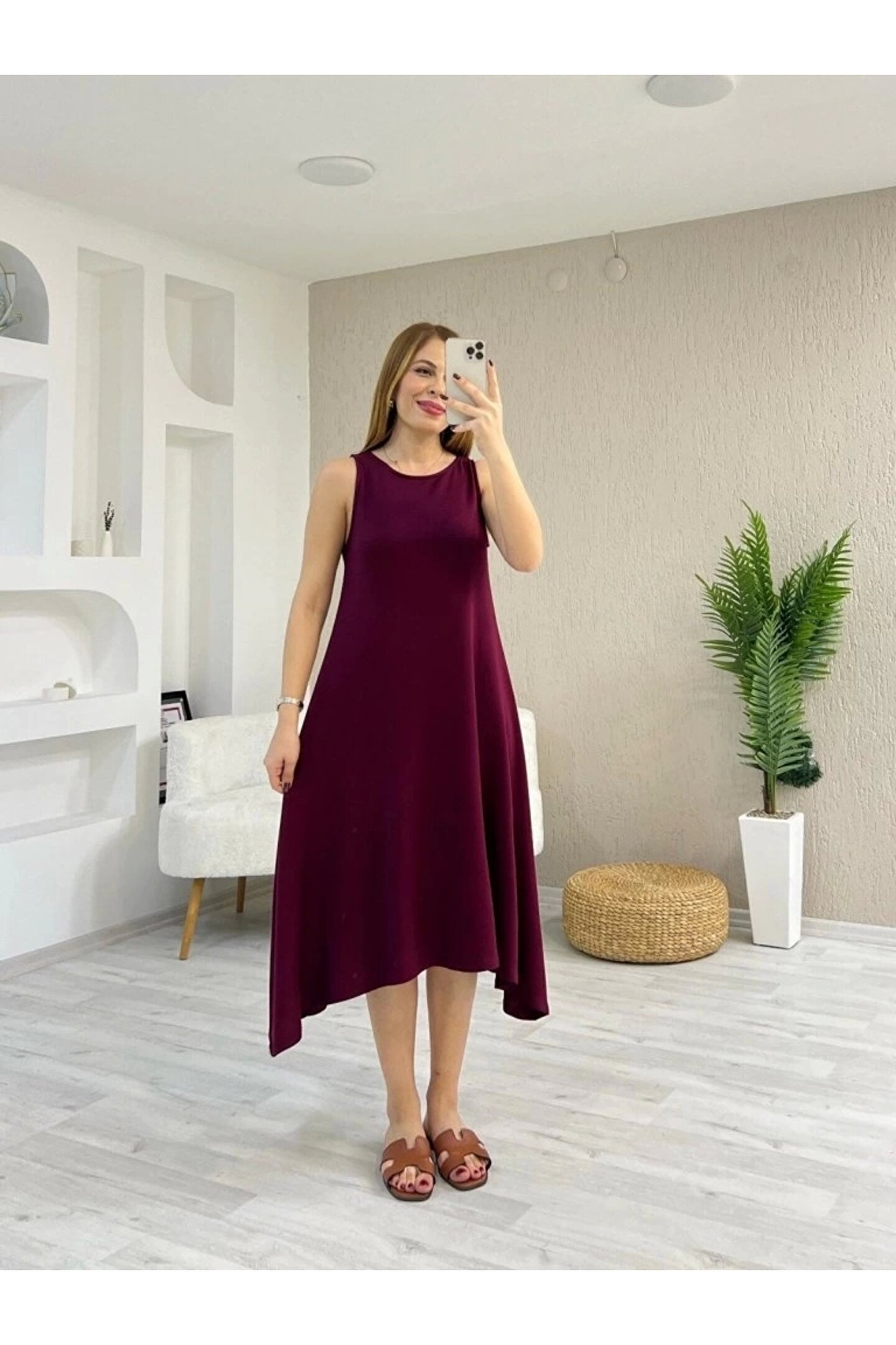 Kadın Askılı Yuvarlak Yakalı Asimetrik Kesim Detaylı Viskon Elbise