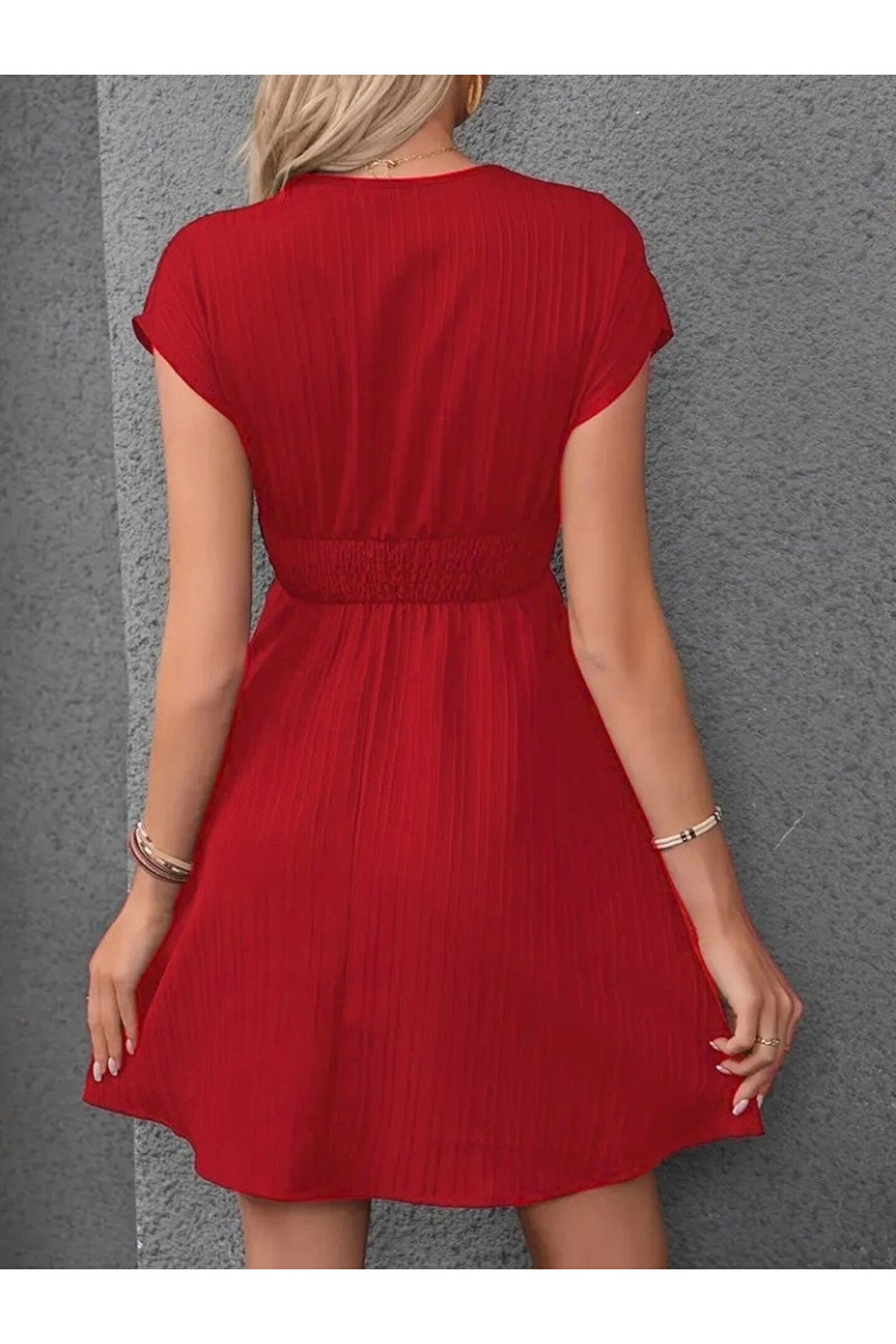 Kadın Kısa Kollu Kruvaze Yakalı Beli Lastikli Bürümcük Elbise