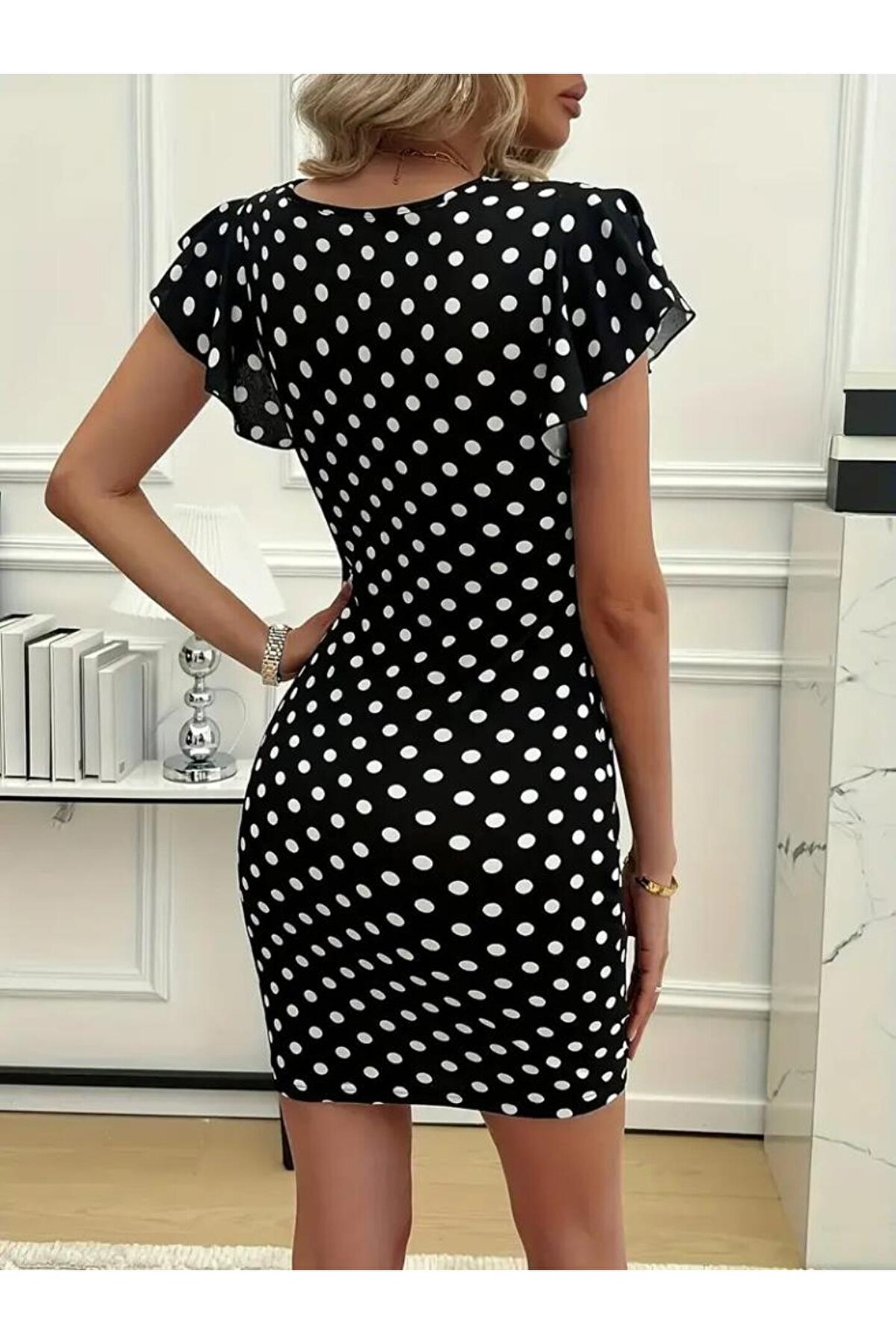 Kadın Kısa Kollu Kruvaze Yakalı örme Puantiyeli Krep Elbise