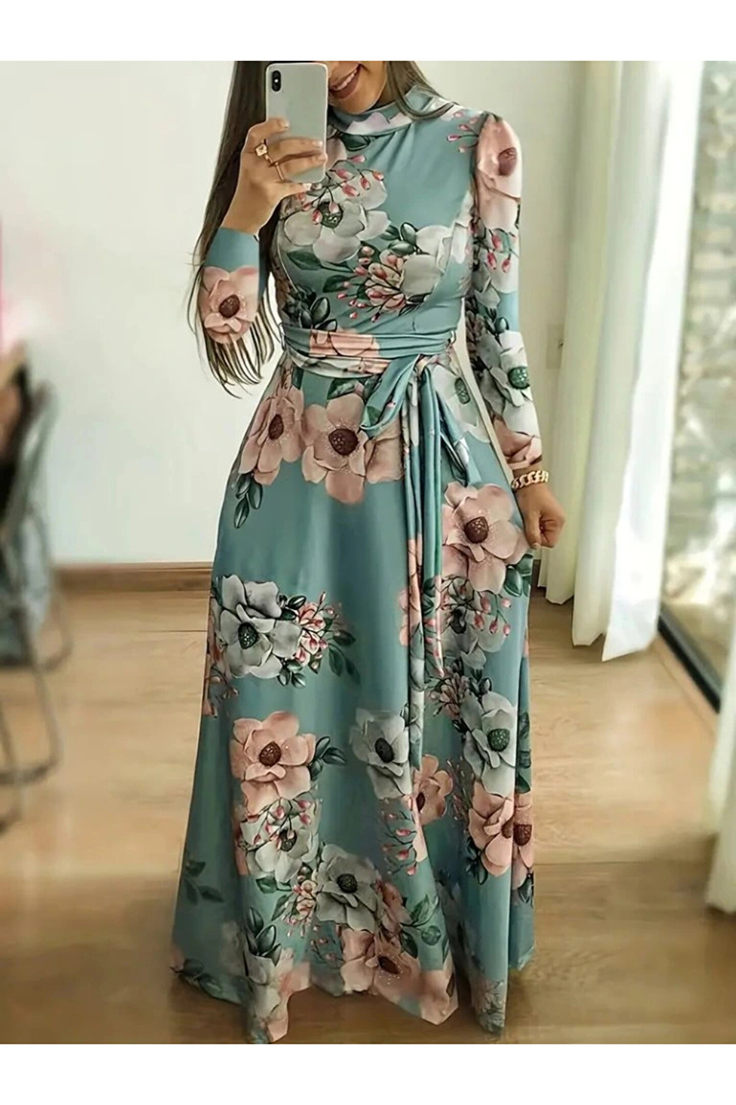 Kadın Uzun Kollu Yuvarlak Yakalı Beli Kuşaklı Desenli Süprem Uzun Elbise
