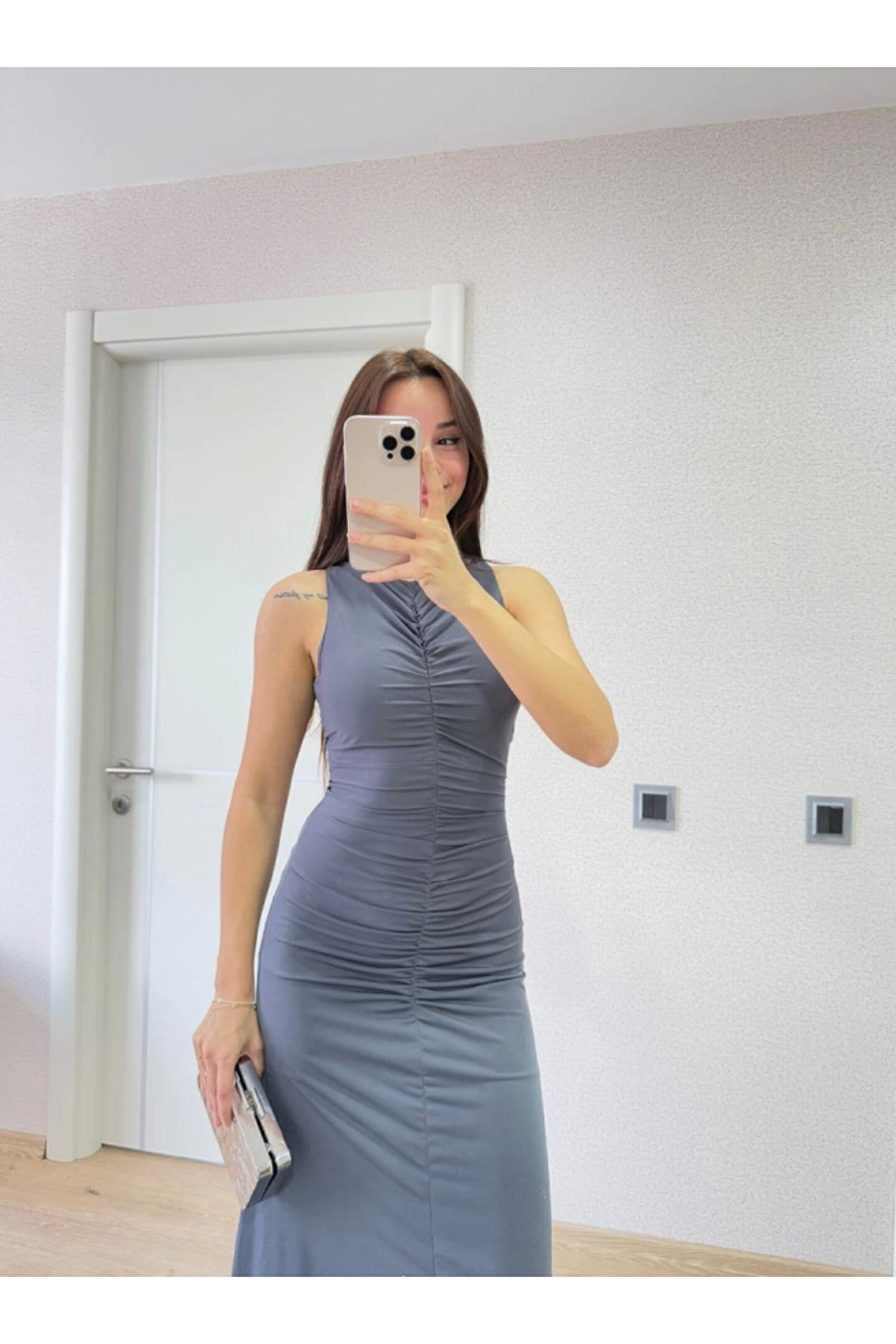 Kolsuz Büzgülü Uzun Elbise - Füme