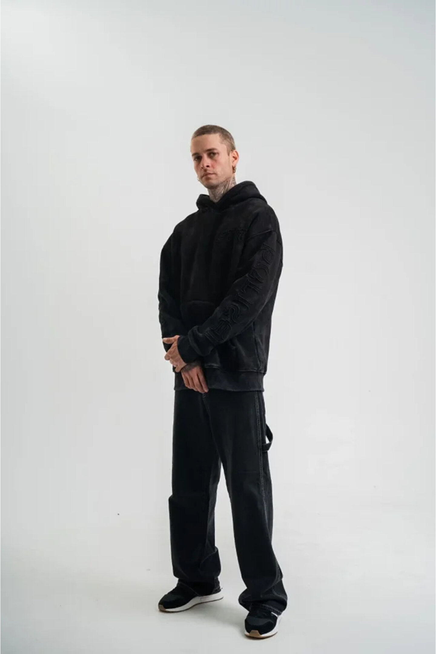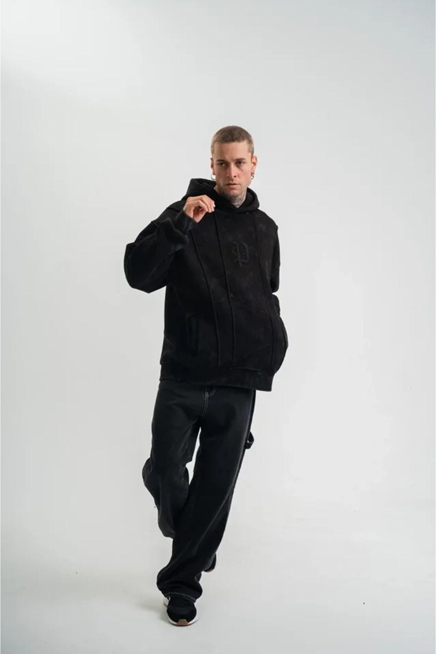 Unisex Uzun Kol Kapşonlu Yıkamalı Nakışlı SweatShirt - Siyah